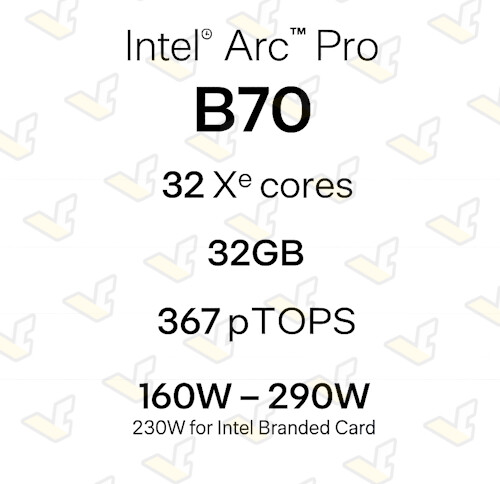 Arc Pro B70 получит 32 ядра Xe2, 32 ГБ ECC GDDR6 памяти и 256‑битную шину с диапазоном энергопотребления от 160 до 290 Вт (230 Вт для референсного дизайна).