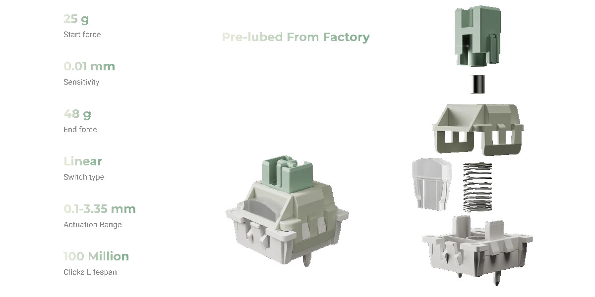 Переключатели Lime имеют лёгкое усилие срабатывания 25 г, ход 3,35 мм и полностью POM‑конструкцию. Среди особенностей — «эргономичная наклонная клавиша пробела», разработанная в соответствии с естественным изгибом пальцев, и встроенная силиконовая подставка для рук.