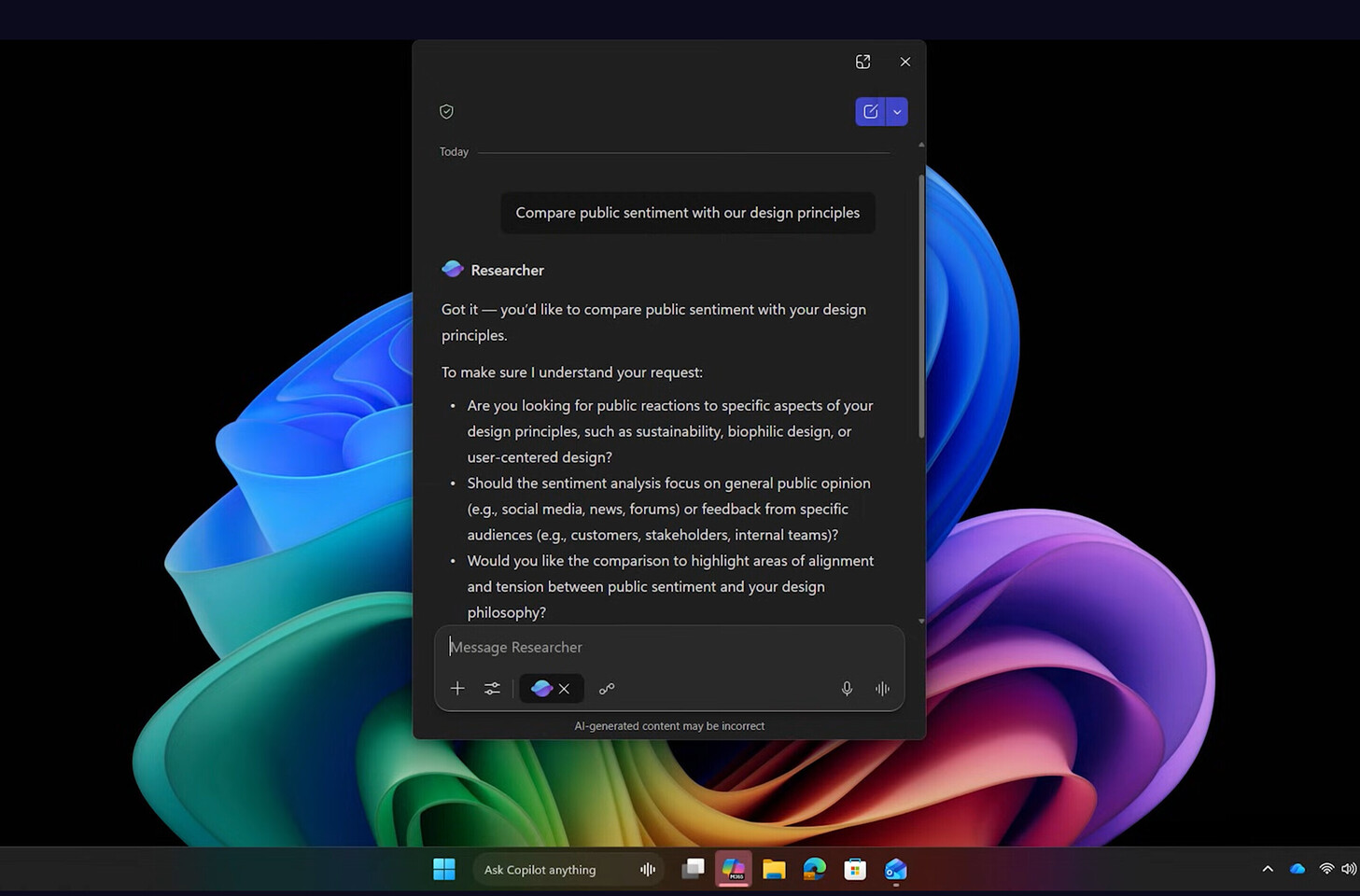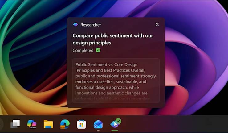 После запуска задания агент появляется на панели задач, как и любое другое приложение. Наведение курсора на него открывает компактное окно состояния, которое показывает ход выполнения и любые запросы на ввод данных пользователем. Визуальные значки информируют, когда агент требует ввода данных или когда задание завершено. Выходные данные от всех агентов направляются в приложение Microsoft 365 Copilot, что позволяет пользователям просматривать результаты в одном месте, даже если агент предоставляется третьей стороной.