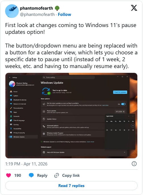 Изменение впервые заметил пользователь «phantomofearth» в Twitter/X, а позже его подтвердило издание Windows Latest. По их словам, Microsoft планирует дать пользователям возможность «приостанавливать обновления на любое время», что значительно расширит контроль над системой.