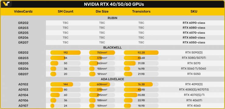 - Память: Rubin может стать первой архитектурой с широким внедрением памяти стандарта HBM4 для серверных решений, в то время как игровые GeForce RTX 60 получат следующее поколение GDDR.