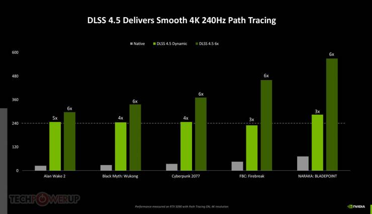 Эти нововведения станут частью обновленного пакета DLSS 4.5. Благодаря новым алгоритмам ШІ, графический процессор сможет создавать до пяти дополнительных кадров на основе одного традиционно отрендеренного, что обеспечит шестикратный рост производительности. Например, игра, работающая при 60 FPS, сможет демонстрировать невероятные 360 FPS.
