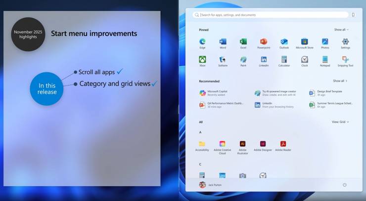 Теперь значок батареи на панели задач отображает процент заряда, что давно запрашивали пользователи. Сам значок переработали, он стал больше и имеет интеллектуальное изменение цвета в соответствии с состоянием питания и зарядки. Меню «Пуск» теперь имеет адаптивный размер, который масштабируется под размеры монитора. Microsoft добавила возможность настройки: пользователи могут добавлять больше ярлыков приложений, а также полностью отключить раздел рекомендуемого контента, который многие считали лишним.