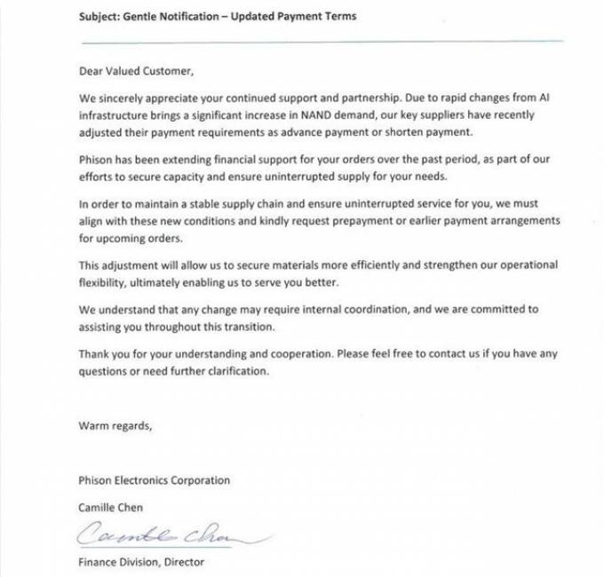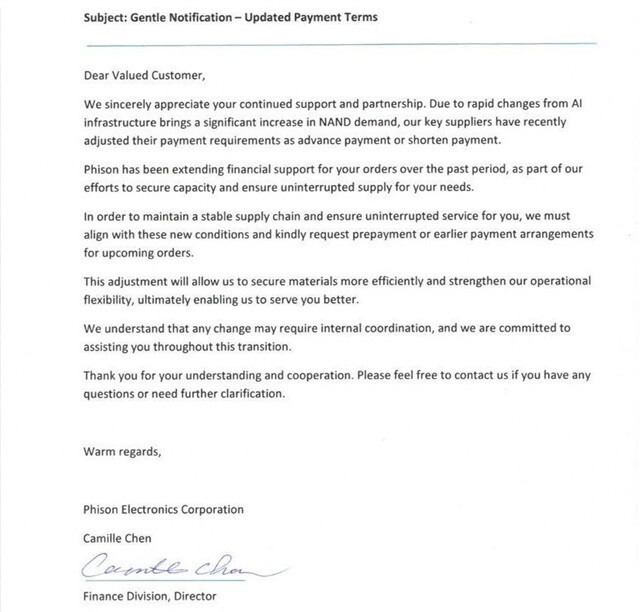 В письме партнёрам компания объяснила, что стремительный рост спроса на NAND вынудил поставщиков ужесточить условия расчётов. Теперь клиенты должны соглашаться на более быстрые финансовые сделки или использовать предоплату как альтернативный способ обеспечения поставок.