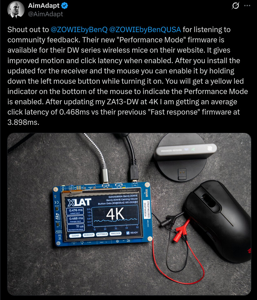 Обозреватель периферии AimAdept протестировал прошивку на модели Zowie ZA13-DW в режиме опроса 4 кГц с использованием тестера задержки Xlat. Он зафиксировал задержку клика на уровне 0,468 мс, тогда как предыдущая версия с режимом "Быстрый отклик" показывала 3,898 мс. Это означает снижение более чем на 3 мс. Хотя в реальных игровых условиях разница может быть не столь заметной, пользователи теперь могут быть уверены, что промахи в игре не связаны с аппаратными ограничениями мыши.