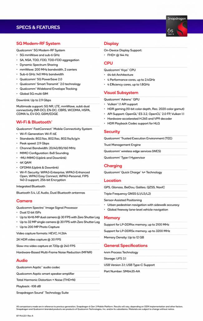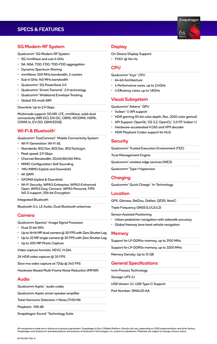 Snapdragon 6s Gen 4, изготовленный по 4-нм техпроцессу, обеспечивает поддержку дисплеев 1080p с высокой частотой обновления до 144 Гц, а также предлагает современный стандарт беспроводной связи Bluetooth 5.4.