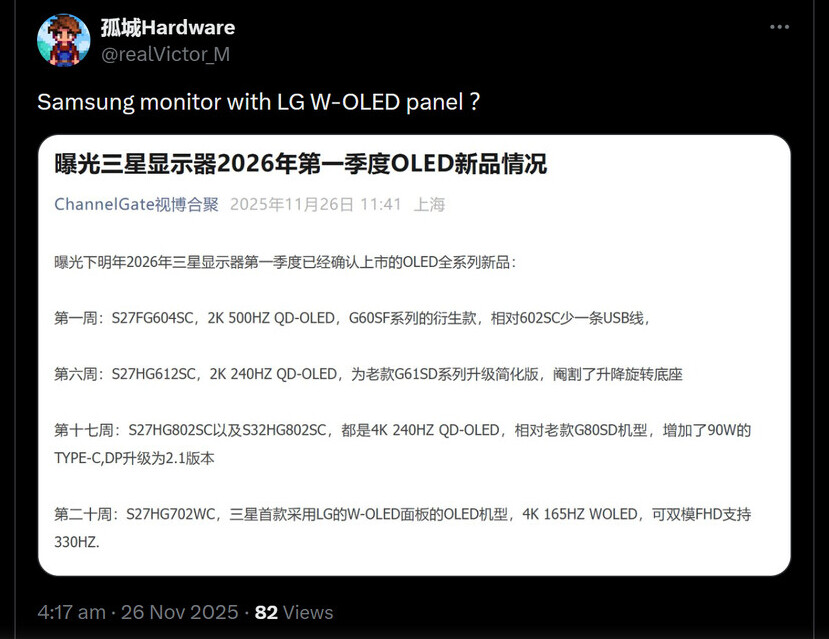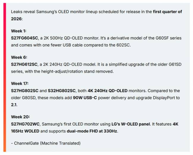 Некоторое количество телевизоров Samsung уже использует технологию LG WOLED, но это соглашение о поставках, похоже, распространилось и на игровые линейки. Отраслевые эксперты утверждают, что Samsung вполне способна производить собственные WOLED-решения, но экономически выгоднее закупать устройства у ближайшего конкурента. Кроме того, утечка информации из Channel Gate указывает на различные будущие модели на базе QD-OLED; в основном это обновления существующих продуктов G60/61 и G80/G81. Запуск этих продуктов запланирован на первую половину 2026 года.