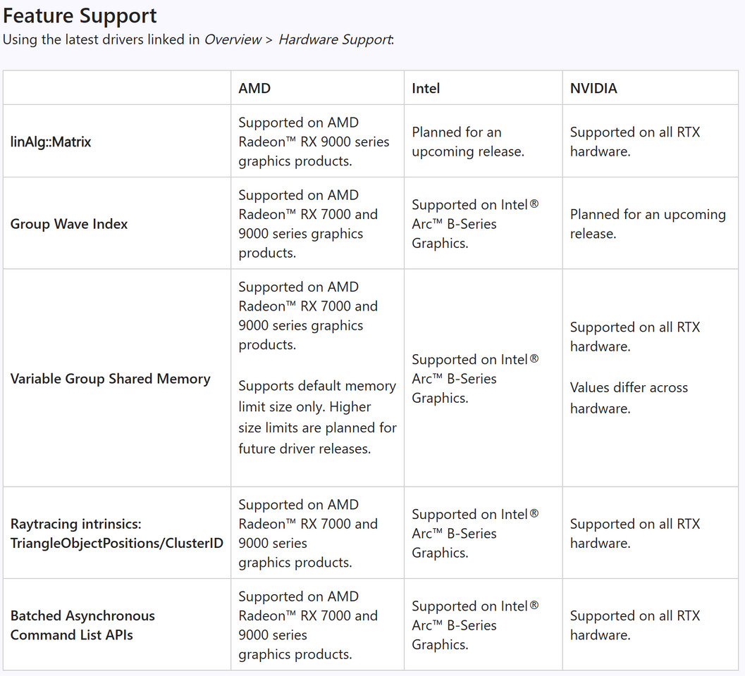 Shader Model 6.10 поддерживается на всех видеокартах NVIDIA RTX, будущие графические процессоры Intel серии B получат совместимость в следующих релизах, а среди AMD только Radeon RX 9000 на базе RDNA 4 будут поддерживать эту функцию. Старые модели остаются вне обновления.
