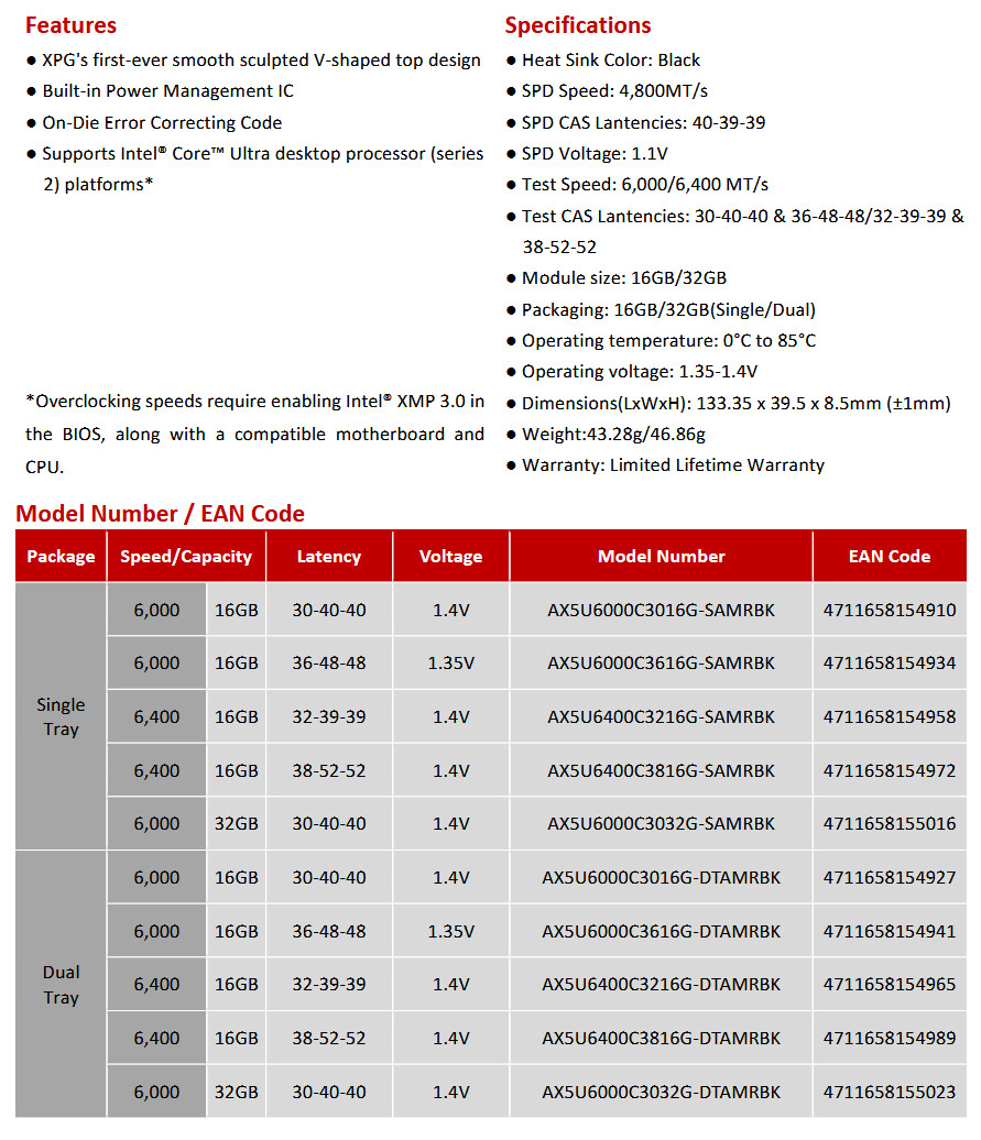 Серия памяти XPG ARMAX DDR5 уже доступна в продаже по всему миру и поставляется с ограниченной пожизненной гарантией.