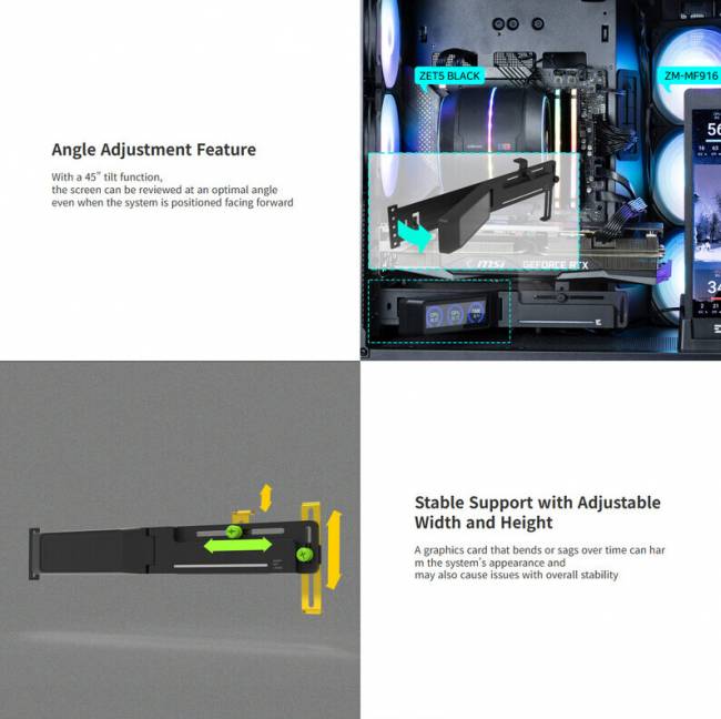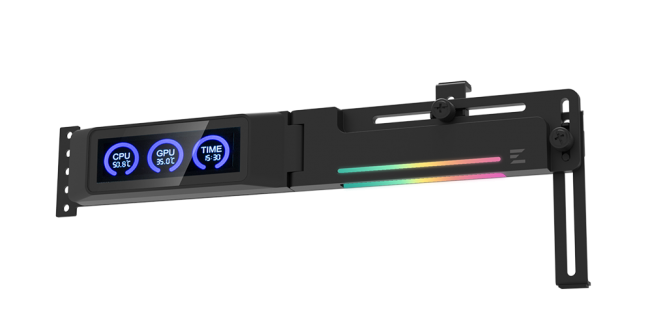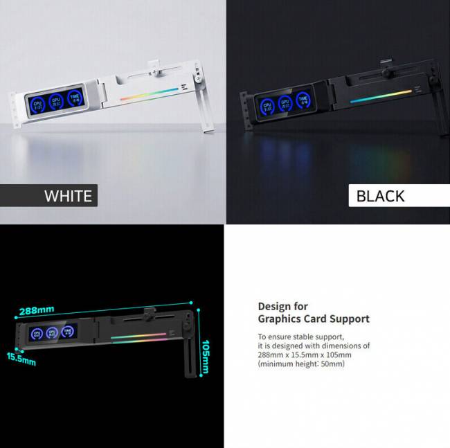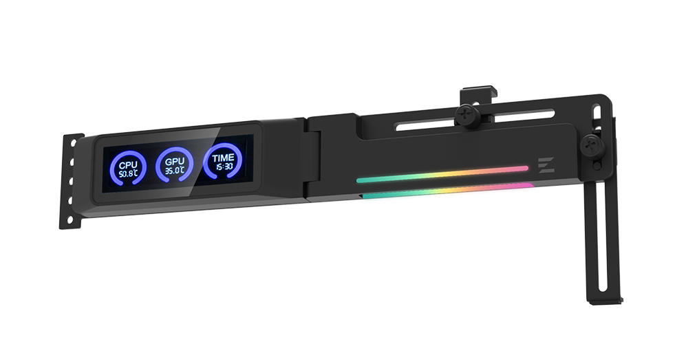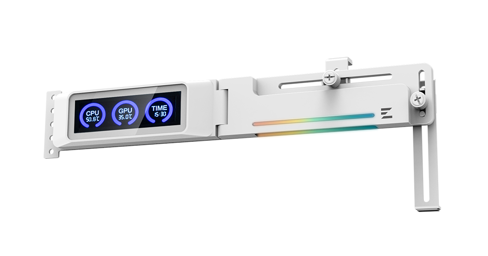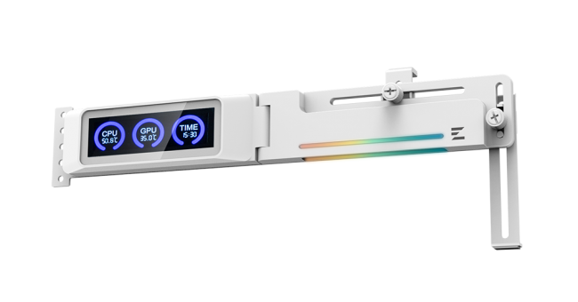 Новая модель ZM-VS3 DS представлена в черном и белом цветах, предлагая не просто защиту от провисания платы, но и дополнительный функционал. Вместо привычной избыточной ARGB-подсветки, Zalman оснастила вертикальные подставки небольшими ЖК-экранами. Они позволяют пользователям отслеживать температуру процессора, видеокарты и текущее время в реальном времени, что делает мониторинг системы более удобным и эстетичным.