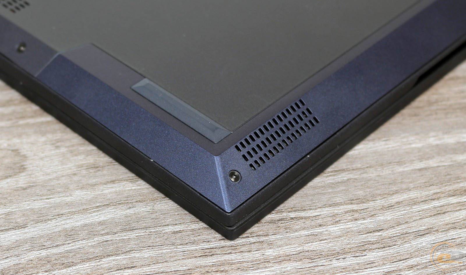 Большая часть корпуса выполнена из алюминиевого сплава с матовой, немного шероховатой поверхностью, которая отлично сопротивляется отпечаткам пальцев. Из пластика выполнена только рамка вокруг экрана. Качество сборки на высоте: ничего не скрипит и не люфтит. В целом ноутбук ощущается в руках очень крепким и добротным устройством. Он успешно прошел сертификацию по военному стандарту MIL-STD-810H и гарантированно выдерживает падение в выключенном состоянии с высоты 120 см.