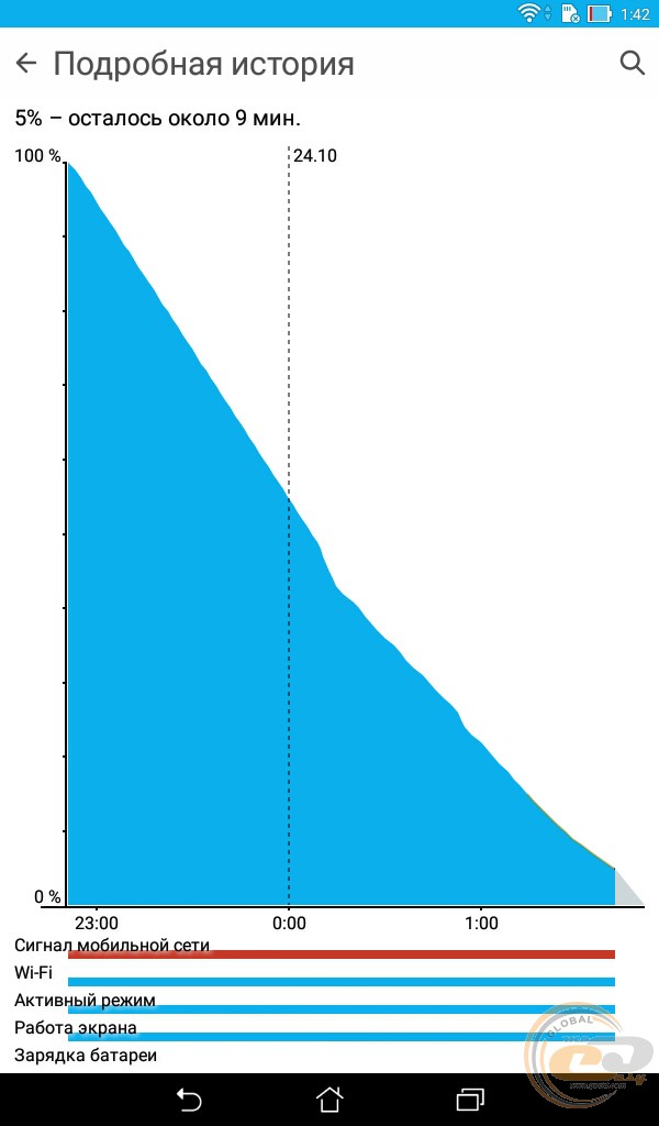В результате просмотра HD-видео (MPEG-4 / AVC, контейнер MKV, поток 4 Мбит/с) при 50% яркости дисплея с включенными модулями Wi-Fi и GPS устройство разрядилось почти за 7 часов. Игровая имитация с использованием Asphalt 8: Airborne при 100% яркости дисплея и включенных модулях Wi-Fi и GPS исчерпала заряд аккумулятора за 3 часа.