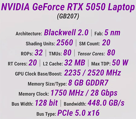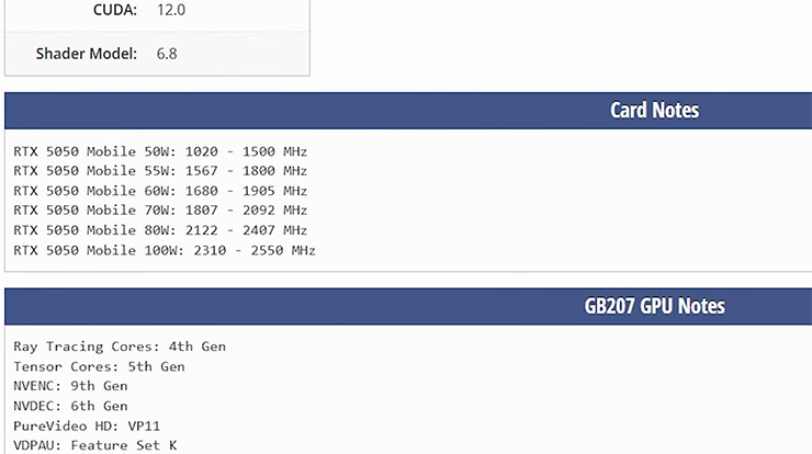 Еще одна немаловажная особенность GeForce RTX 5050 Laptop – широкий диапазон энергопотребления и соответственно рабочих частот. В зависимости от ноутбука и его систем питания и охлаждения, ее TDP может колебаться от очень экономных 50 Вт, рассчитанных скорее на тонкие офисно-игровые модели с частотами от 1020 до 1500 МГц, и вплоть до сотни в топовых игровых конфигурациях с поддержкой Dynamic Boost, благодаря которому можно получить даже 115 Вт при от 2310 до 2550 МГц и выше.