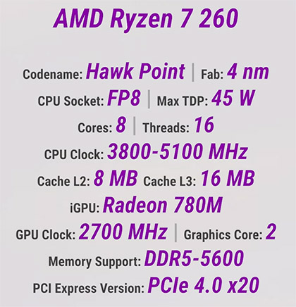 В его основе работает AMD Ryzen 7 260, 8-ядерный 16-поточный процессор с базовыми частотами в 3,8 ГГц и бустом до 5100 МГц, который в пределах TDP до 45 Вт демонстрирует конкурентную производительность как в играх, так и в ресурсоемких задачах. Помогает ему интегрированная графика AMD Radeon 780M. В легких задачах ноутбук переключается на нее, что помогает сэкономить заряд.