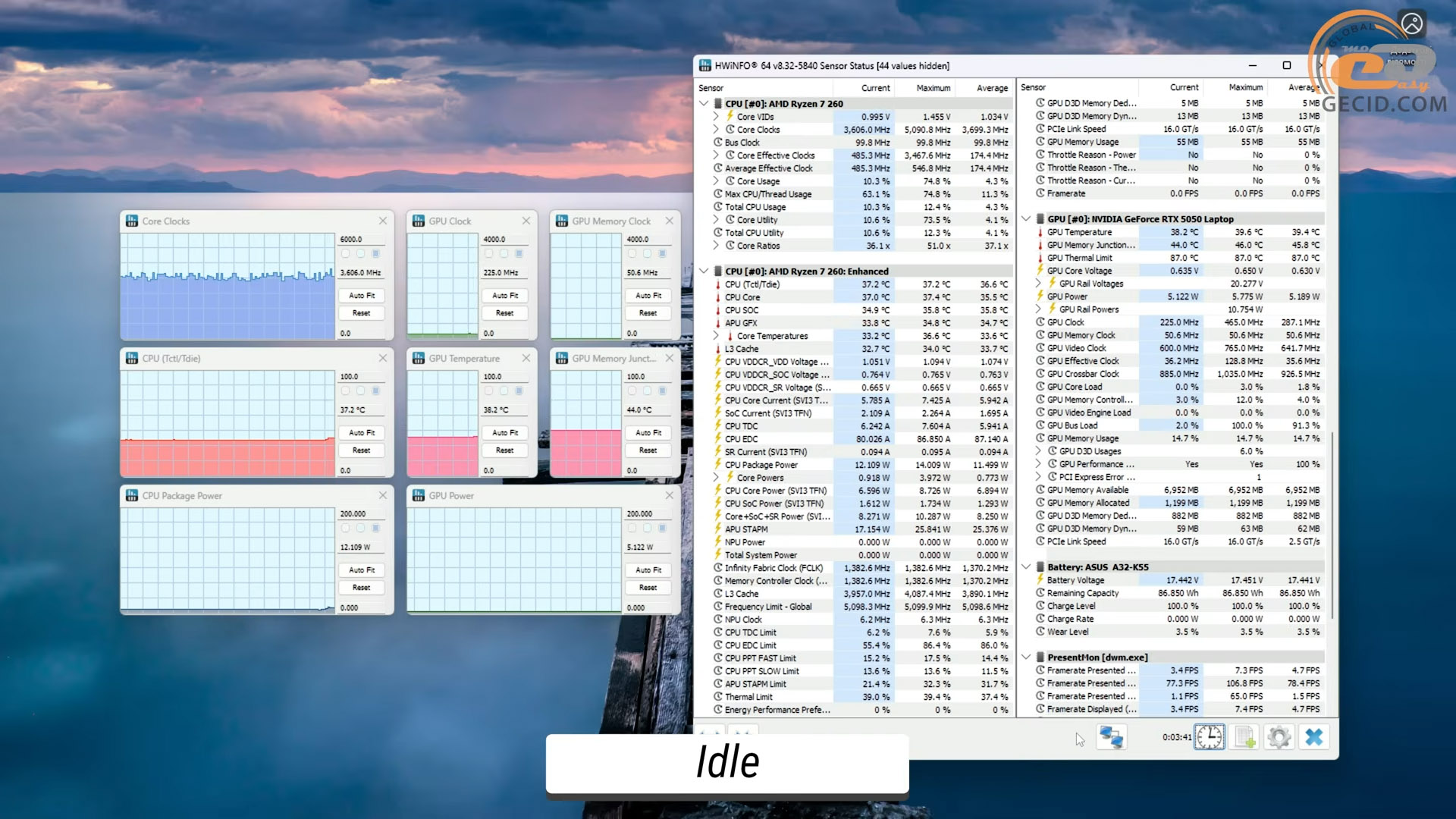 Без нагрузки в положении простоя температуры на CPU и GPU большую часть времени находились около отметки в 35 и 38 градусов соответственно. А частота работы видеокарты вполне ожидаемо находилась на минимальном уровне.