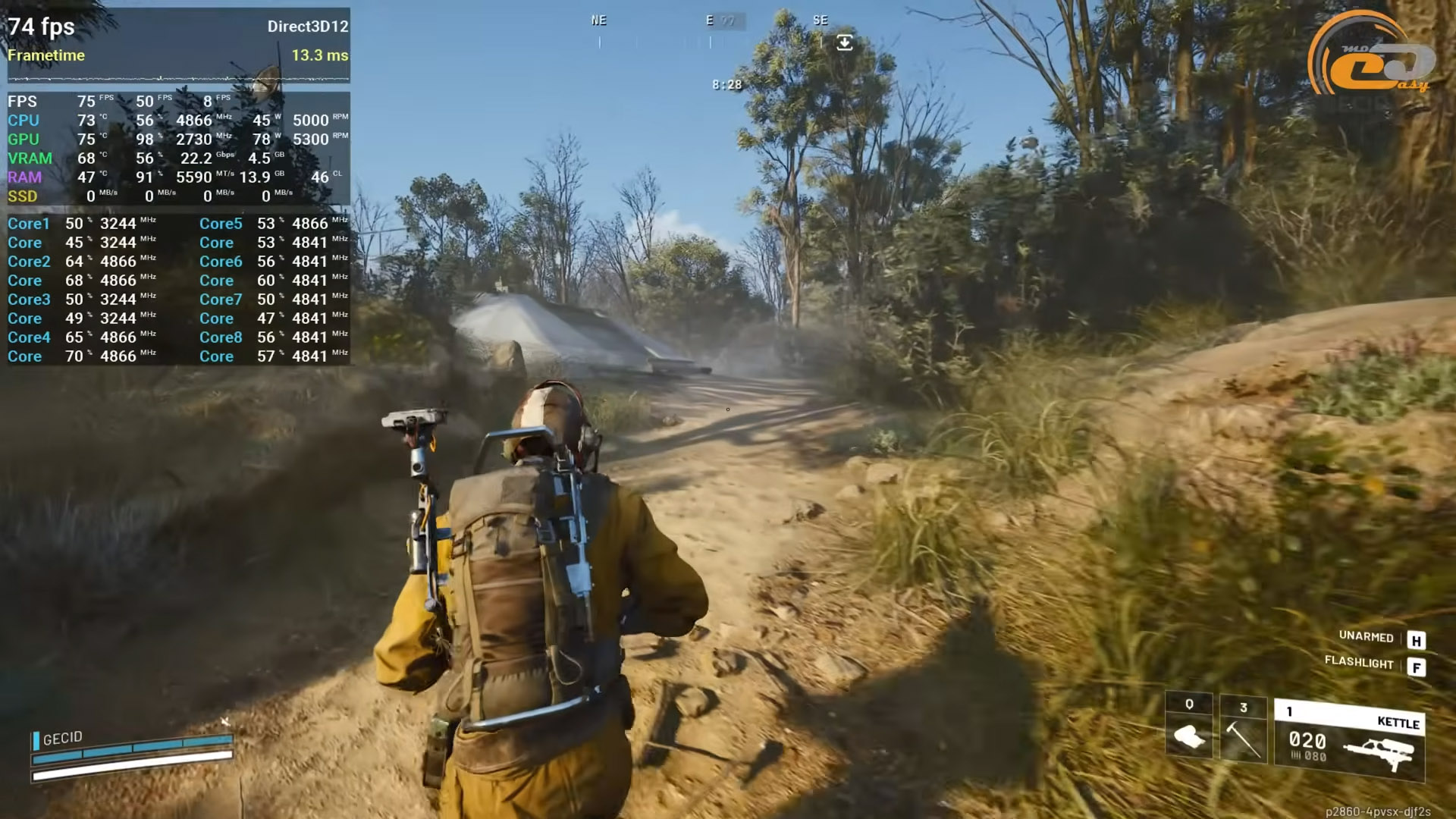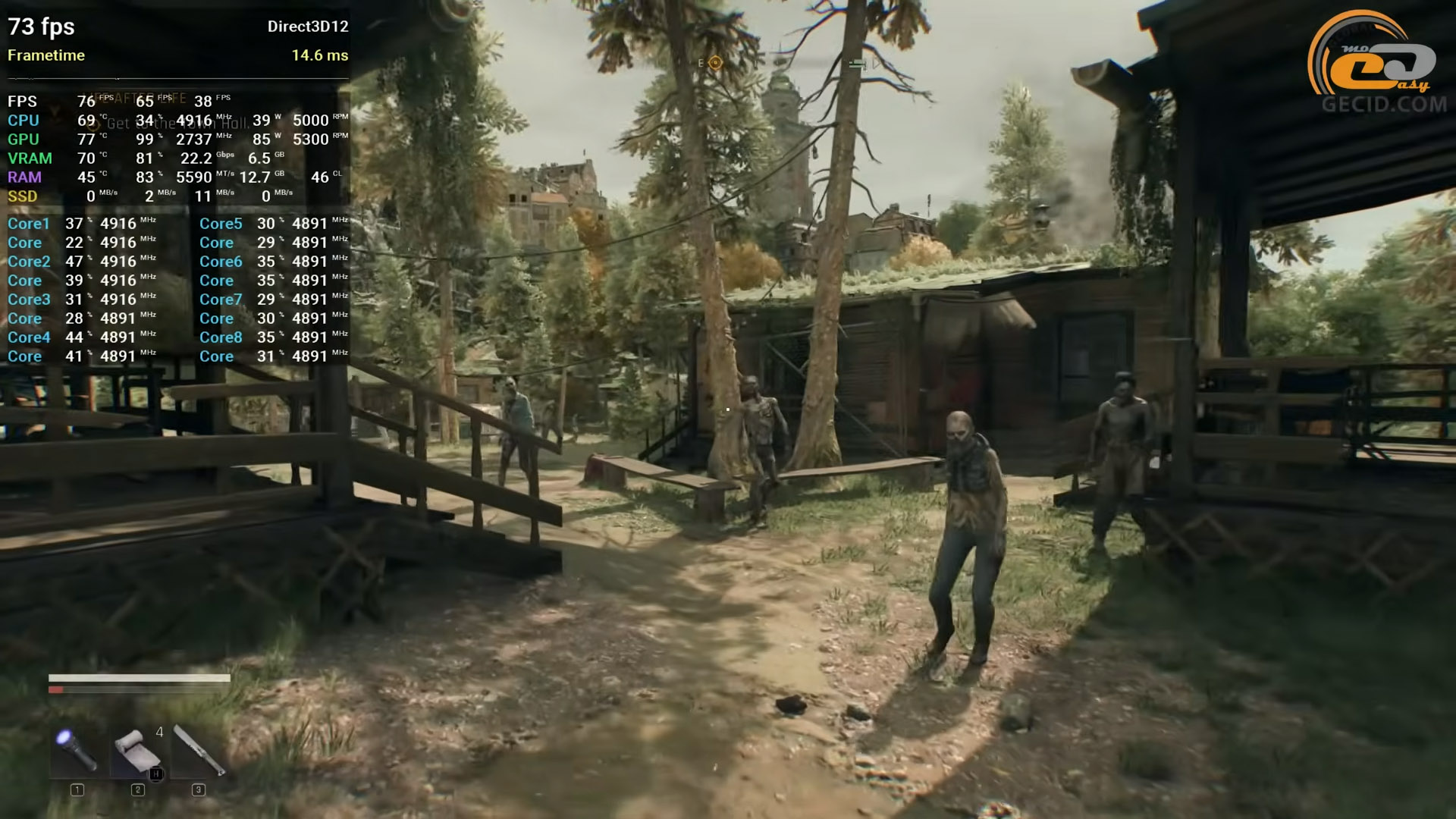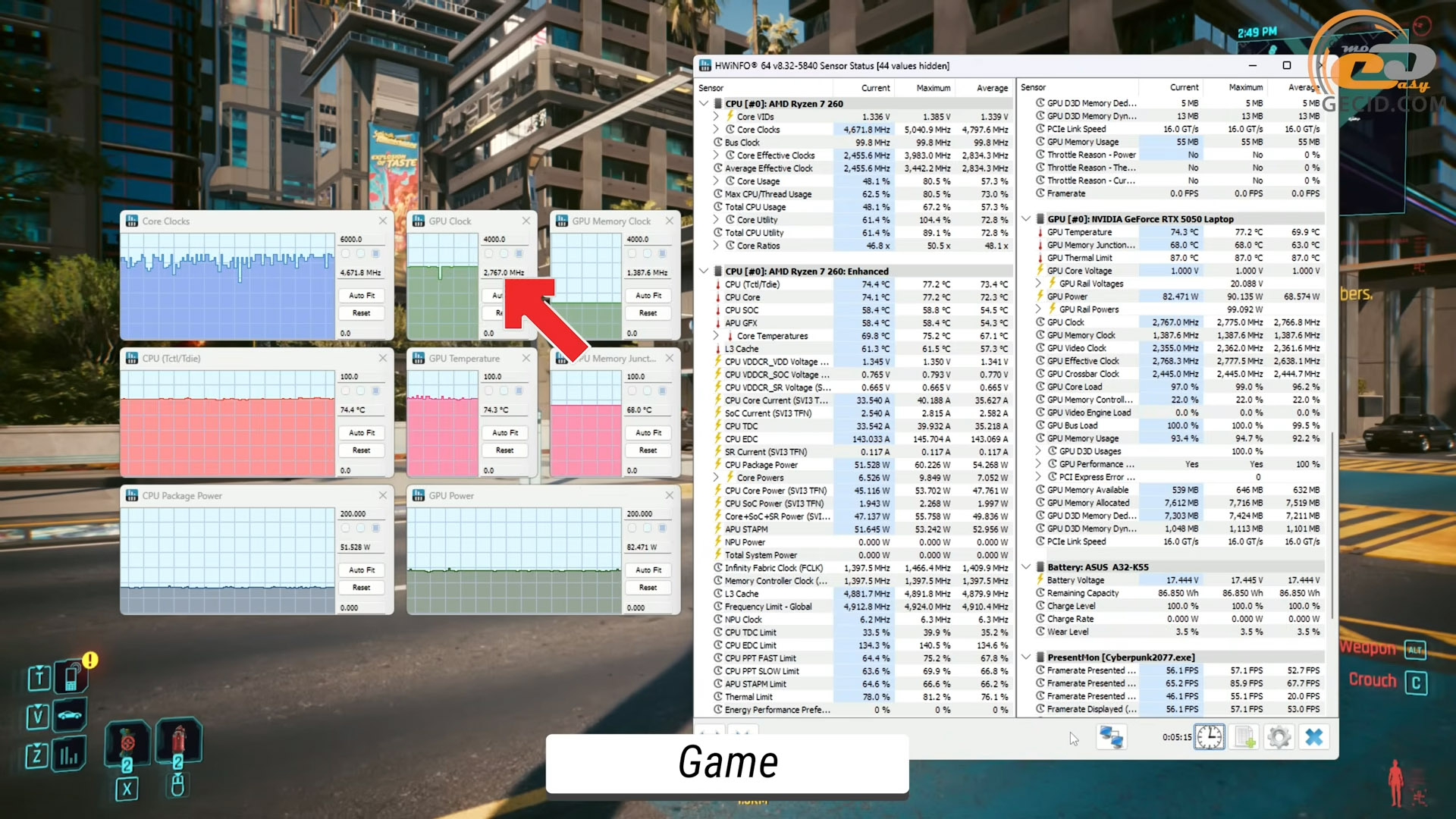 В одном из игровых сценариев, на примере Cyberpunk 2077, температурный уровень GPU колеблется от 73 до 76 градусов, а рабочие частоты поднялись до уровня в примерно 2760 МГц. Что касается CPU, то он немного остыл и закрепился у отметки в 74 градуса Цельсия.