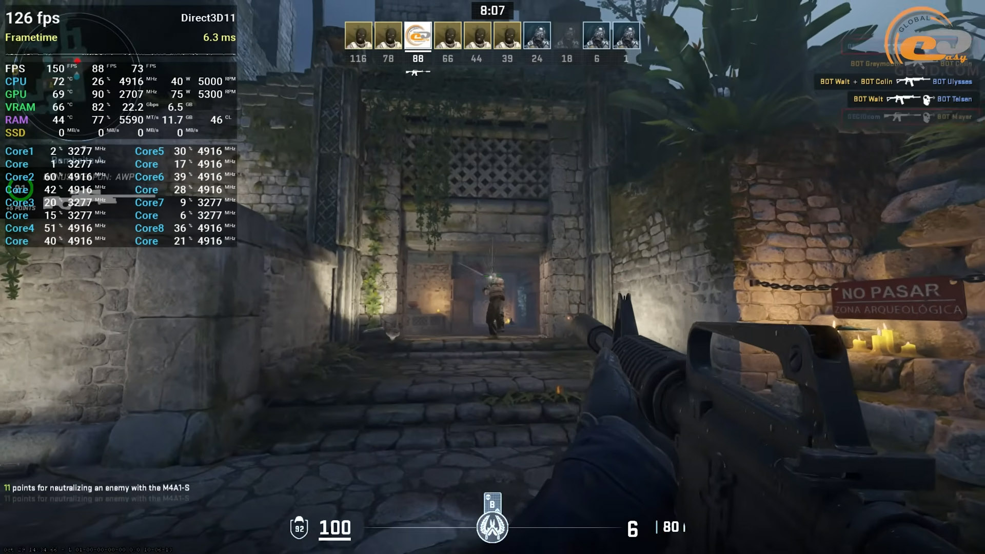 При очень высоких настройках графики в Counter Strike 2 испытуемой системе не хватило 15 средних кадров в секунду, чтобы дотянуть уровень собственной герцовки без какой-либо помощи. Так что если перейти к более низким настройкам, то будет возможность увидеть полную синхронизацию.