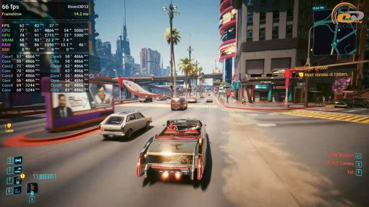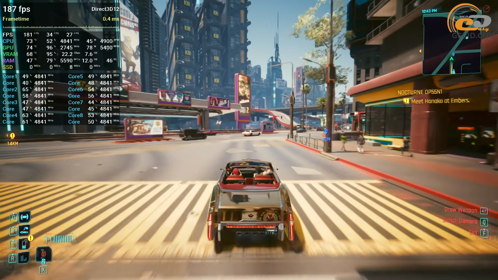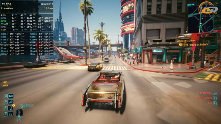 Если появится желание пройти Cyberpunk 2077 без какого-либо вмешательства функций интеллектуального ускорения рендеринга, то на ультранастройках такое условие становится вполне реальным – видим около 70 кадров на показателе средних кадров в секунду.