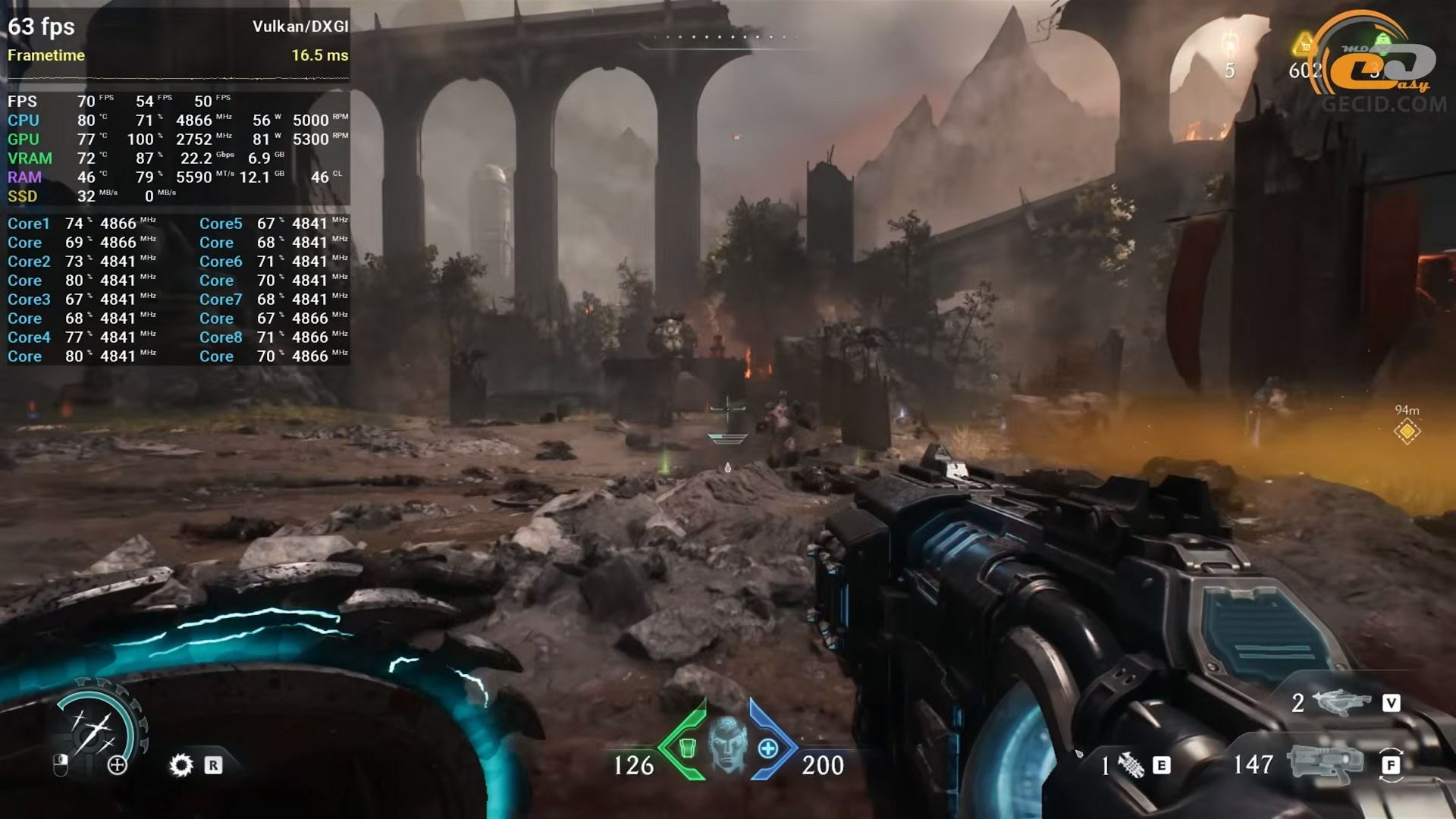 Пресс графики Ultra Nightmare вместе с DLSS в режиме качества позволяет получить максимум эмоций от зачистки территорий от монстров в DOOM: The Dark Ages. С такой комбинацией настроек работаем с показателями FPS почти всегда выше 60, если не смотреть на короткие проседания во время тяжелых заруб.