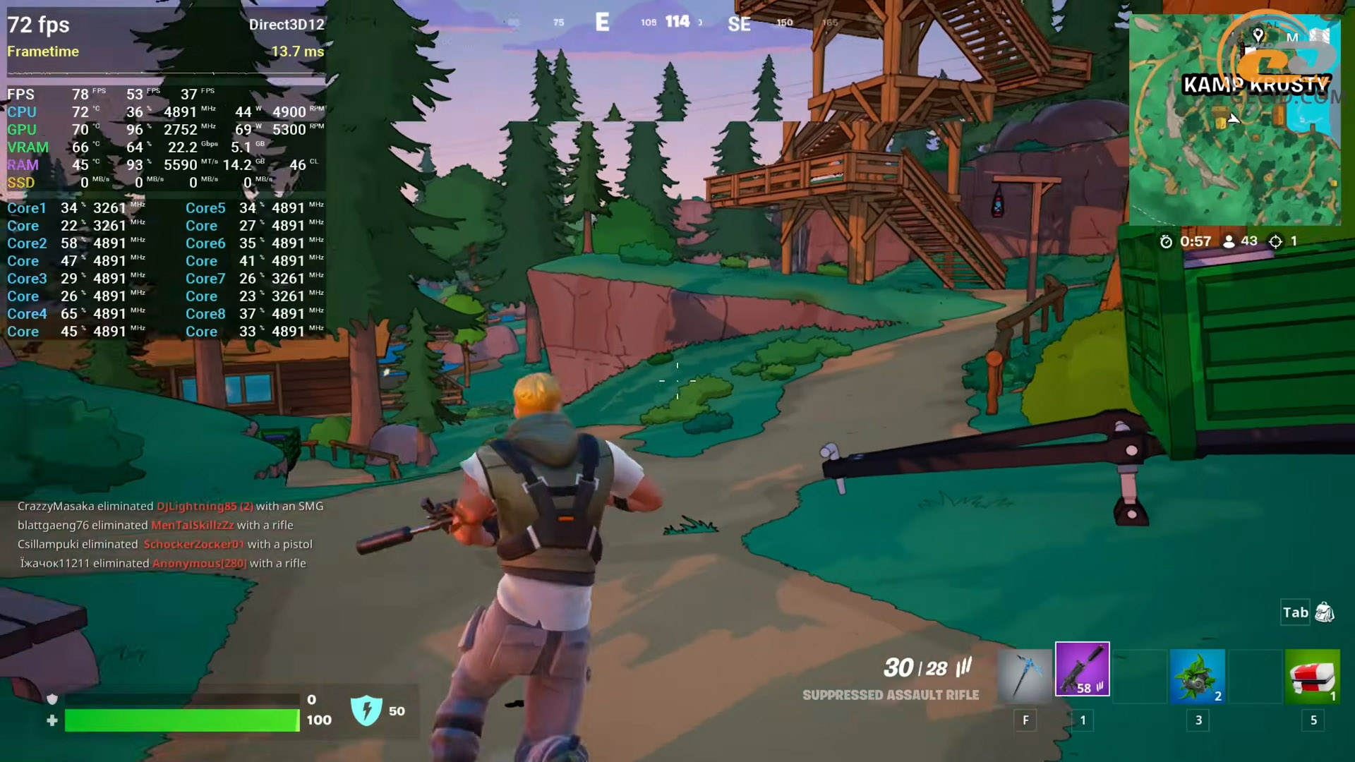 В новом мини-сезоне Fortnite полностью погружаемся в стиль «Симпсонов» — арт-команда постаралась так, что иногда действительно кажется, что управляешь персонажем из мультсериала. Визуальная составляющая стала более легкой для вычислений, поэтому даже при эпических настройках вместе с аппаратной трассировкой лучей игра работает очень комфортно. Плавность геймплея не подводит – около 75 FPS на счетчике средних кадров. Так что общие впечатления в такой атмосфере максимально положительные.