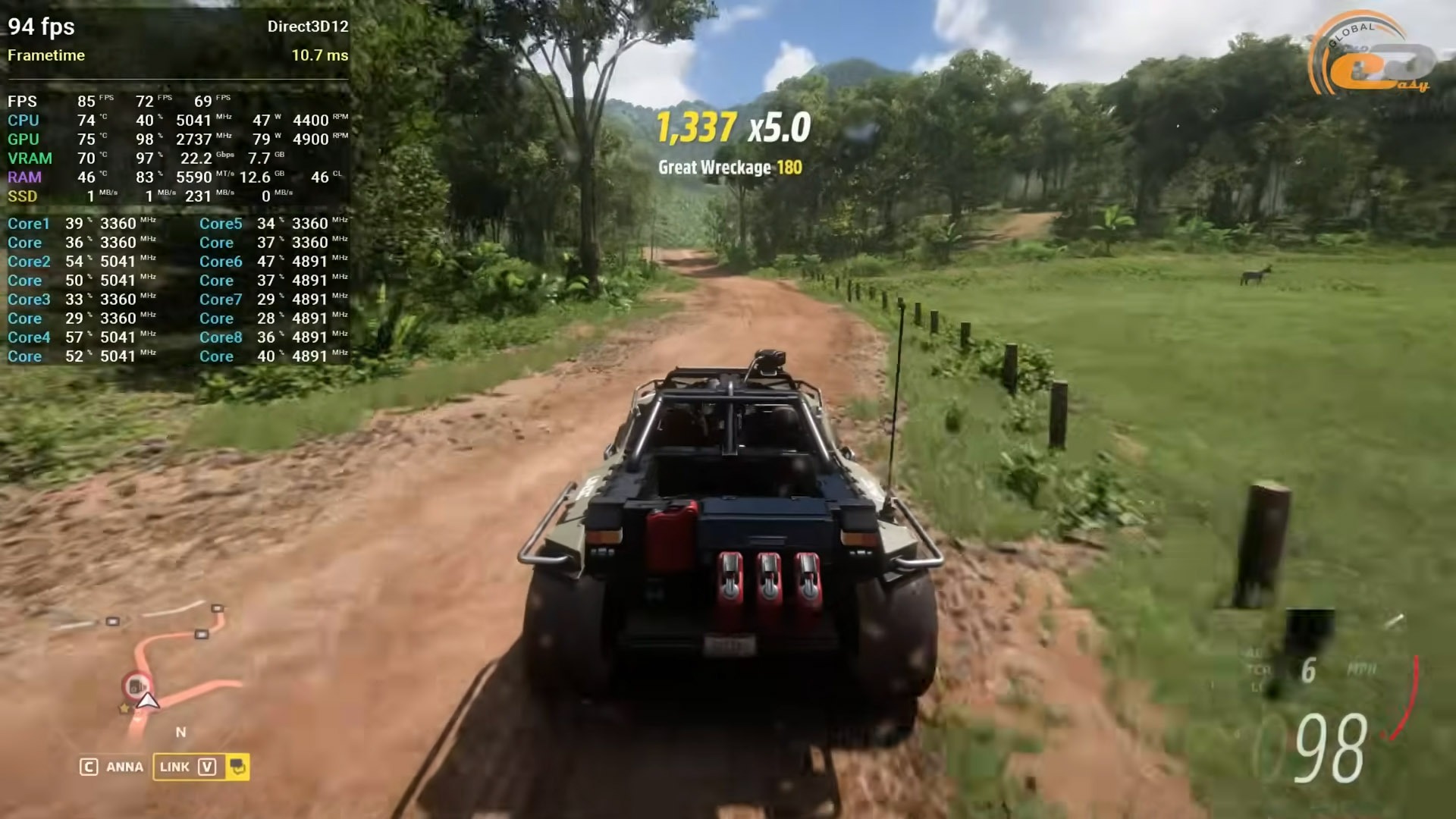 На максимально доступном пресете Forza Horizon 5 смотрится и играет просто замечательно – картинка насыщеная, а километры под колесами пролетают без видимых проблем. Однако стоит учитывать одну вещь: видеопамять забивается полностью, поэтому иногда могут проскакивать легкие фризы, особенно в густонаселенных районах или при стремительном изменении локаций. Но в общем-то это все равно очень комфортный и плавный геймплей.