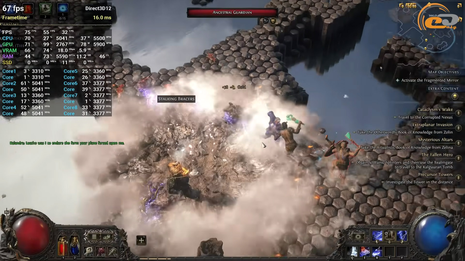 В Path of Exile 2 на высоких настройках вместе с глобальным освещением ультрауровня и DLSS в режиме качества игра чувствует себя очень уверенно. Но как только на экране появляется настоящий хаос – десятки монстров, взрывы, постоянные касты – частота кадров может проседать чуть ниже 60 FPS, что вполне ожидаемо для такого «мясного» экшена. Также интересной деталью становится факт того, что тестовая запись сделана на карте, которая визуально выглядит максимально простой – минимум растительности и больших объектов. Но именно здесь FPS оказался ниже, чем на живописных локациях с геометрией, деревьями и тенями. Так что недостаточная оптимизация все еще дает о себе знать, и игра иногда ведет себя совершенно непредсказуемо.