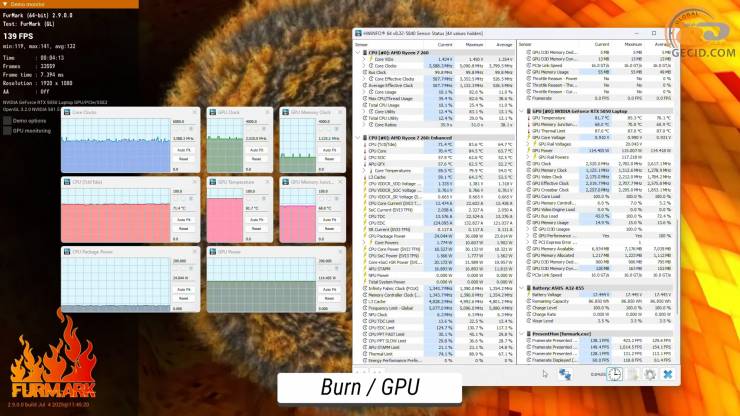 При нагрузки сугубо на видеокарту в тяжелой «баранке» FurMark, она разогревается уже до заметных 82 градусов, при которых система охлаждения пытается максимально спасти ускоритель от чрезмерно высоких температур, что приводит к заметному шуму. Что касается рабочих частот GPU, то они колебались около 2500 МГц. В настоящее время температуры процессора находились около отметки в 70 градусов.