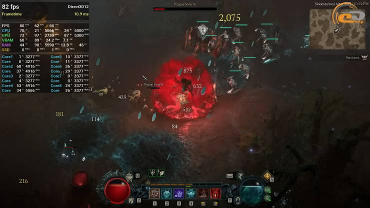 На ультранастройках в Diablo IV системе нужно немного «подумать» и подгрузить нужные ресурсы после загрузки уровня, поэтому сначала сталкиваемся с неприятными подергиваниями. Однако, впоследствии ситуация стабилизируется и удается получить достаточно высокие показатели FPS в размере 80 средних кадров в секунду.