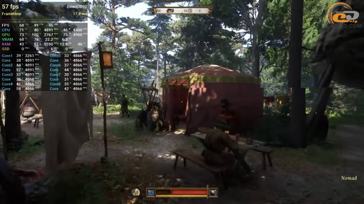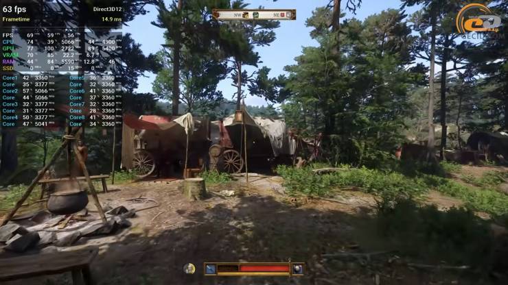 Kingdom Come: Deliverance 2 уже с первых минут показывает, что это одна из самых красивых средневековых игр современности. На Ultra настройках вместе с DLSS Performance картинка получается удивительно насыщенной – поэтому густые леса создают живую атмосферу, а апскейлер в таком режиме не сильно «режет» глаз. Так что играть приятно, но чувствуется, что игра выжимает из видеокарты максимум — в небольших поселениях появляются незначительные проседания ниже 60 FPS.