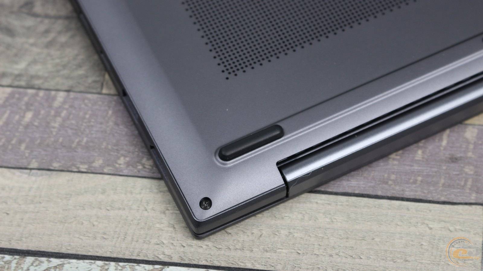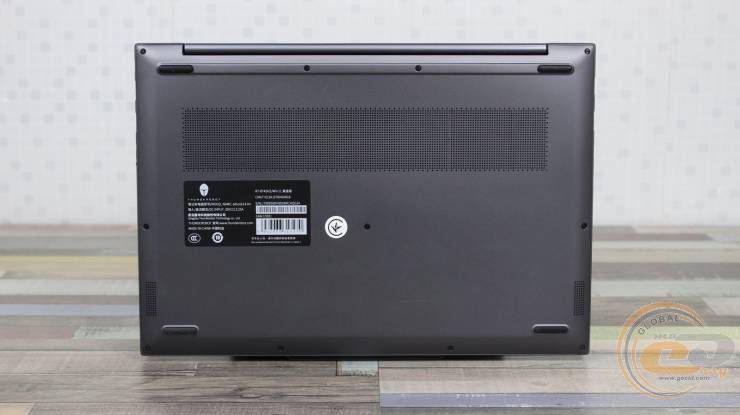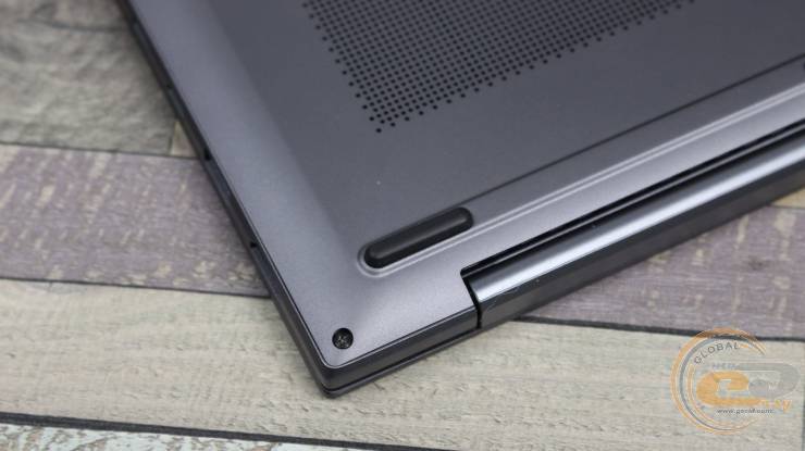В закрытом состоянии задняя часть почти полностью прикрыта сплошным шарниром дисплейного блока. После открытия экрана рядом с правым краем открывается зона вентиляционных отверстий, через которые выводится горячий воздух наружу.