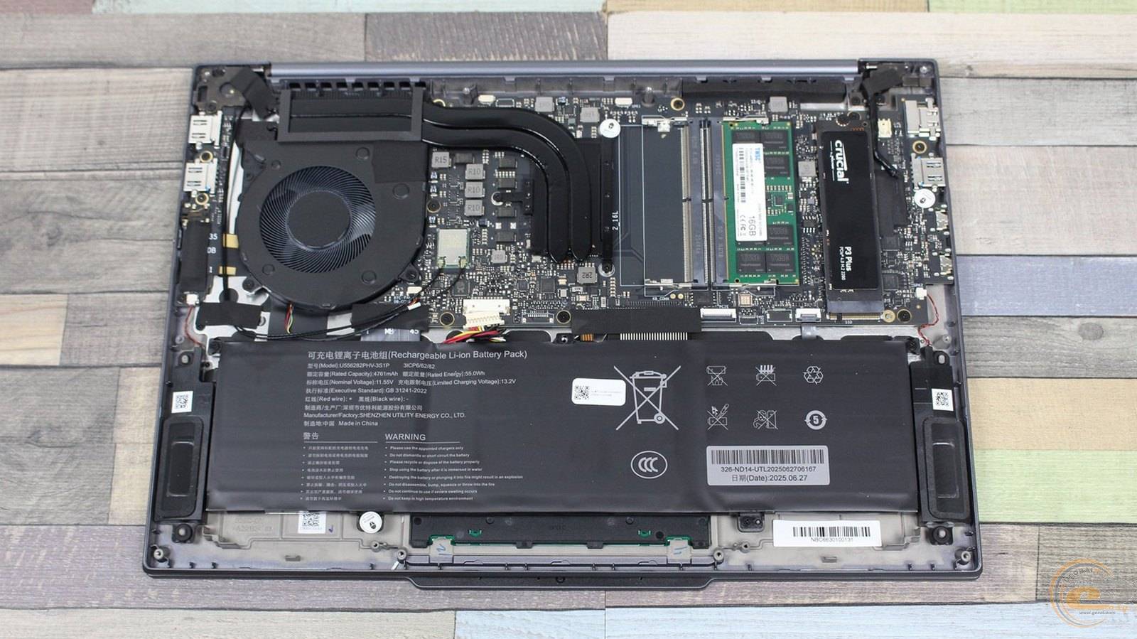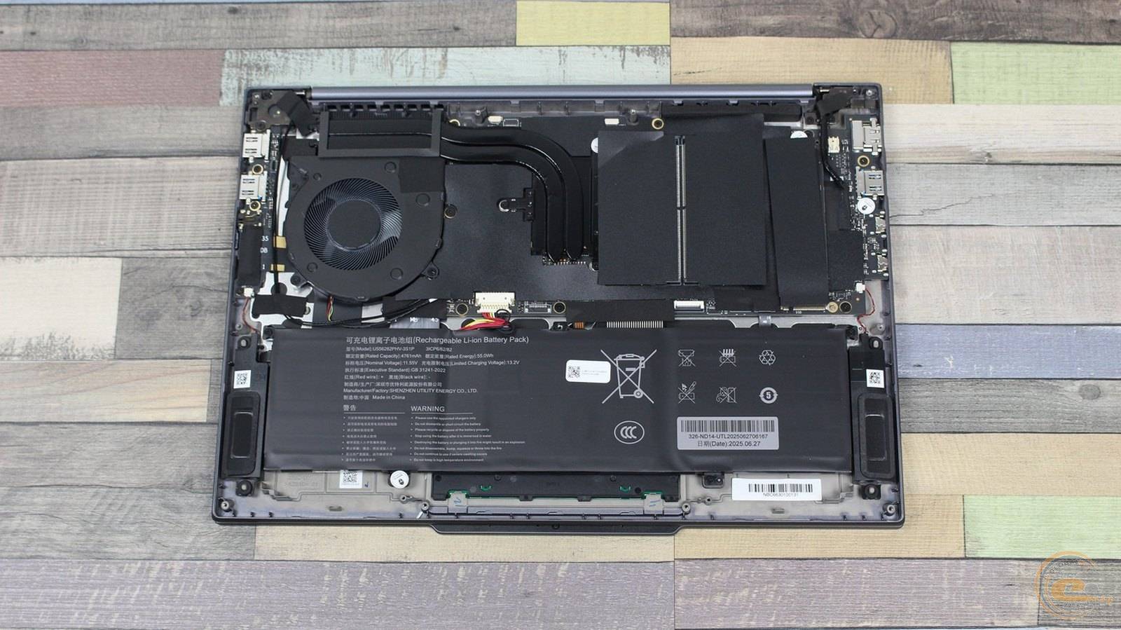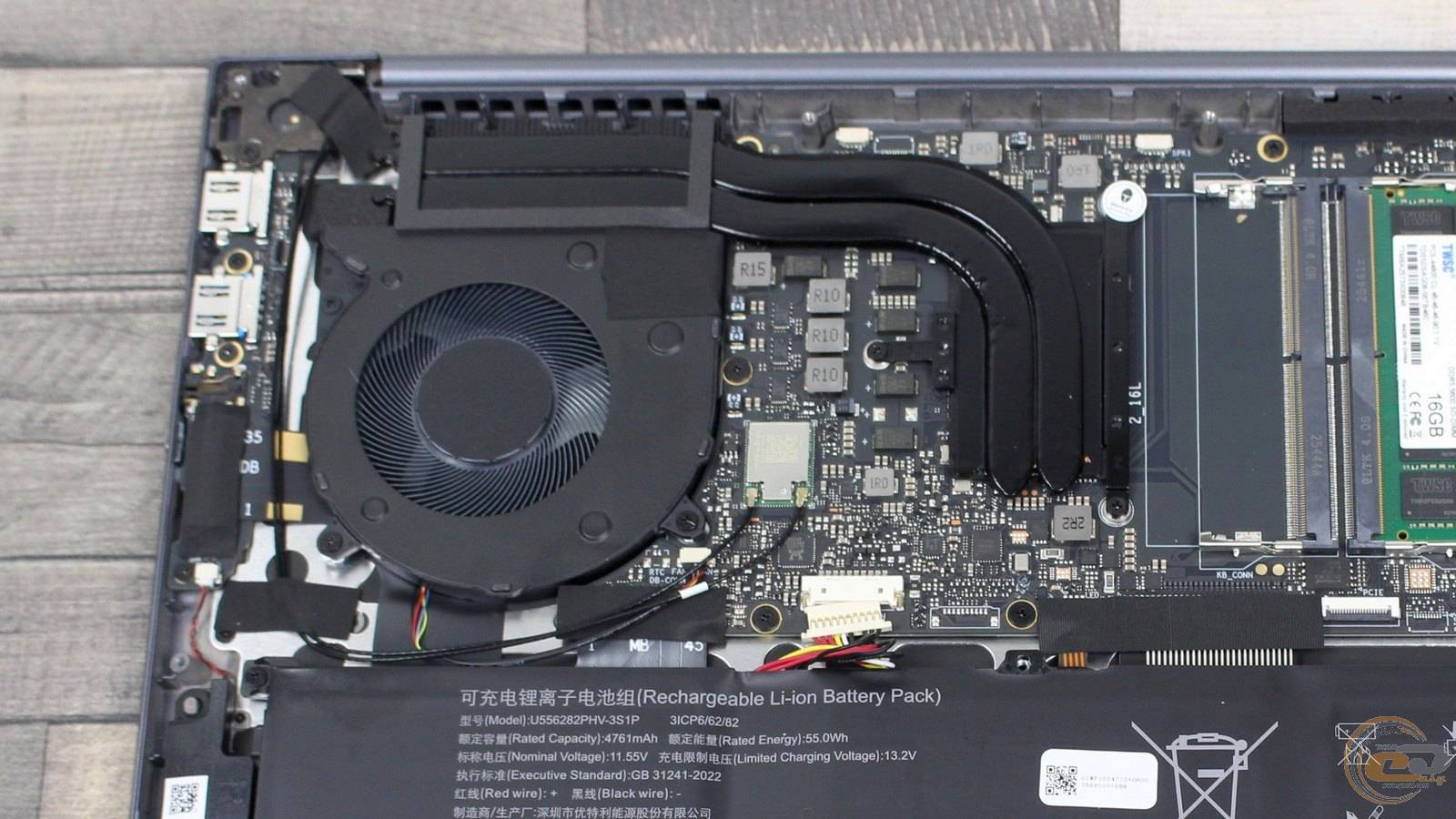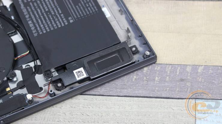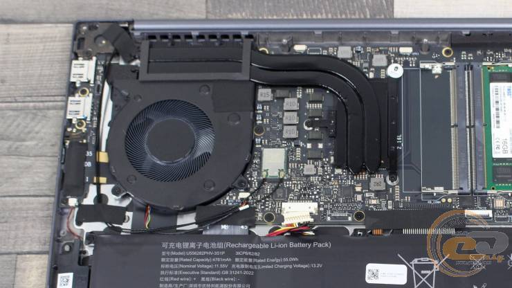 Ноутбук имеет несъемный 3-элементный литий-ионный аккумулятор (US55282P-HV-3S1P / Shenzhen Utility Energy Co., Ltd.) емкостью 4716 мАч (55 Втч) при напряжении 11,55 В.