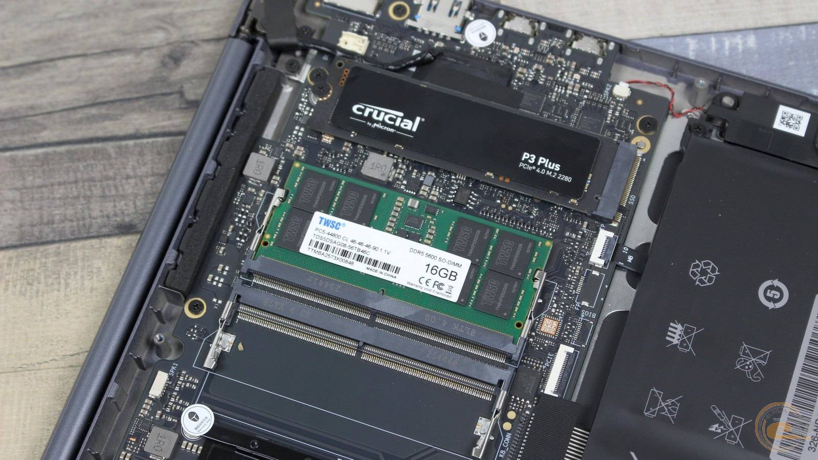 В системе используется стандартная мобильная конфигурация с двумя слотами SO‑DIMM, позволяющая полностью заменять или добавлять модули — в отличие от многих ультрабуков с распаянной памятью. В настоящее время установлен только один модуль DDR5-5600 SO-DIMM объемом 16 ГБ (TWSC TDS5DSAG08-56TB46C с чипами Micron).
