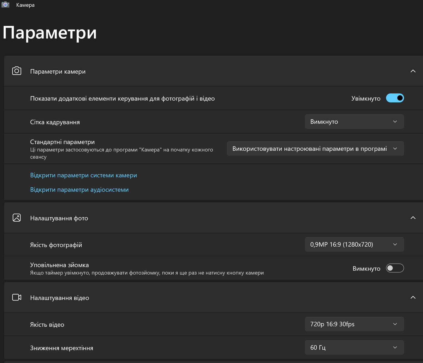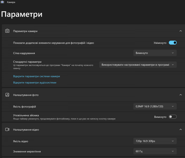 Веб-камера записывает видео в формате HD (1280×720) с частотой 30 кадров в секунду. Качество изображения приемлемо при достаточном освещении, однако в более темных условиях детализация заметно снижается и появляется шум. Фото также обладают разрешением 0,9 МП в соотношении 16:9 — этого достаточно для видеосвязи, но не больше. Поддерживается функция понижения мерцания на 50/60 Гц, что немного улучшает стабильность картинки при искусственном освещении.