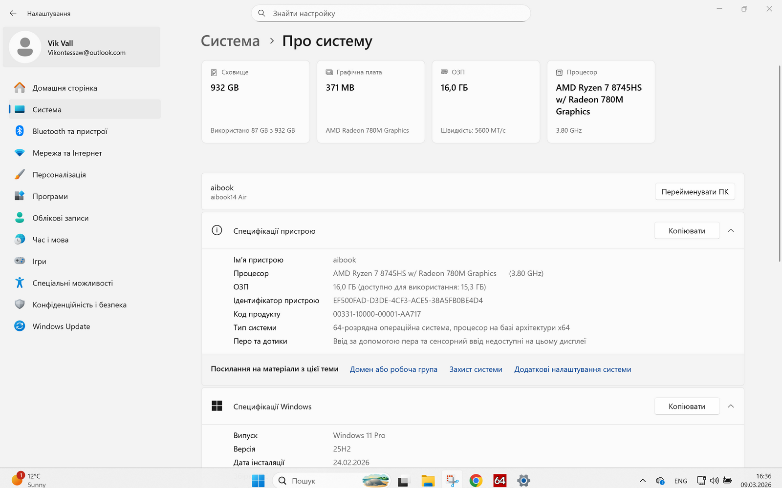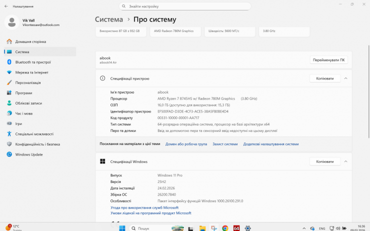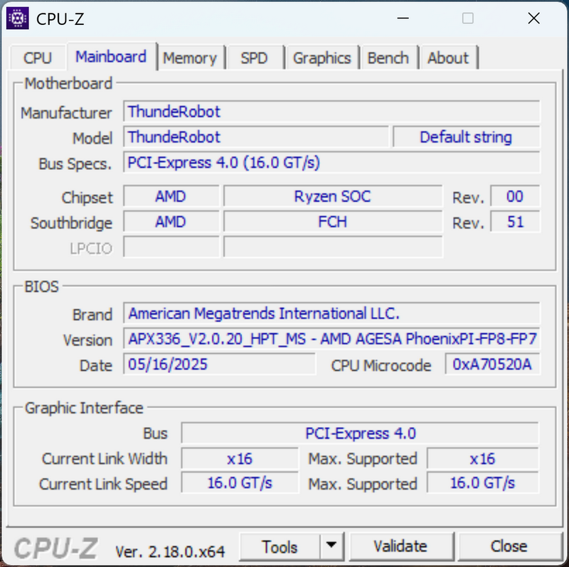 Thunderobot Aibook14 Air построен на платформе AMD Zen 4 и оснащен процессором AMD Ryzen 7 8745HS (8 ядер/16 потоков, базовая частота 3,8 ГГц с повышением до 4,9 ГГц в Boost-режиме). Объем кэш-памяти L3 составляет 16 МБ, а тепловой пакет (TDP) варьируется в диапазоне 35–54 Вт в зависимости от нагрузки. Это решение ориентировано на баланс производительности и энергоэффективности, что логично для ультрабука.