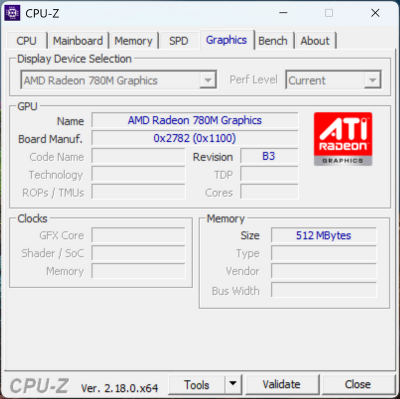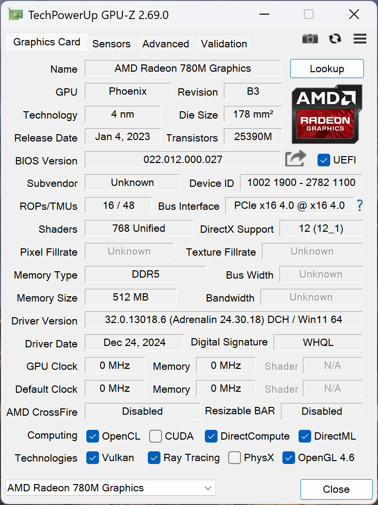 AMD Radeon 780M (RDNA 3 Phoenix 3, 12 CU @ 300 – 800 МГц, до 2,7 ГГц в Boost-режиме) |