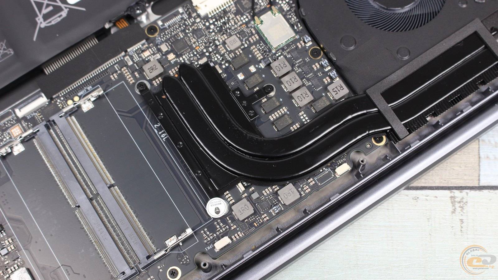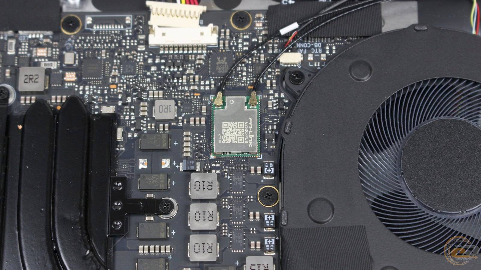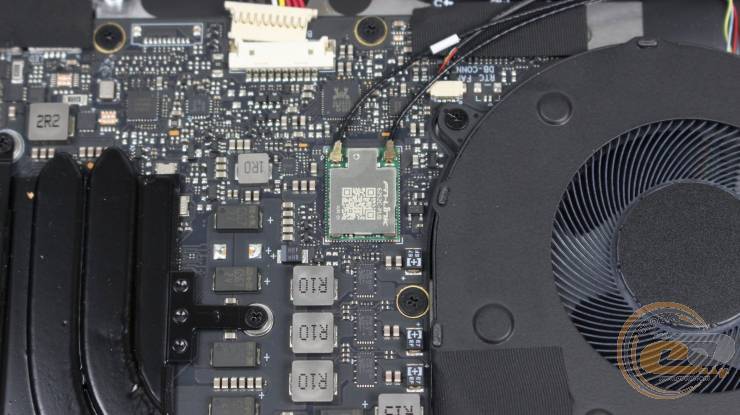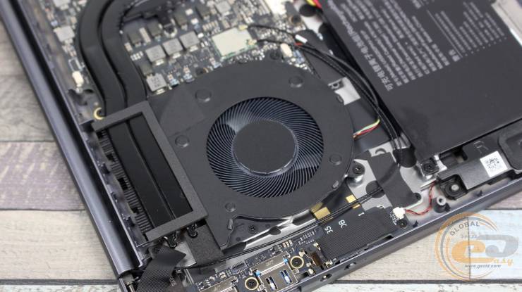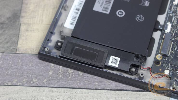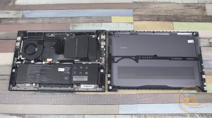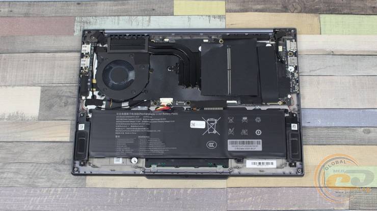 Внутри ноутбука использована классическая схема компоновки: верхнюю часть занимает материнская плата с системой охлаждения, а вдоль передней кромки размещена большая аккумуляторная батарея.