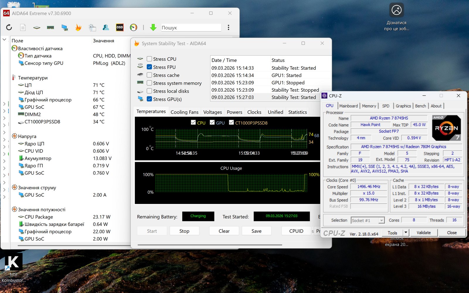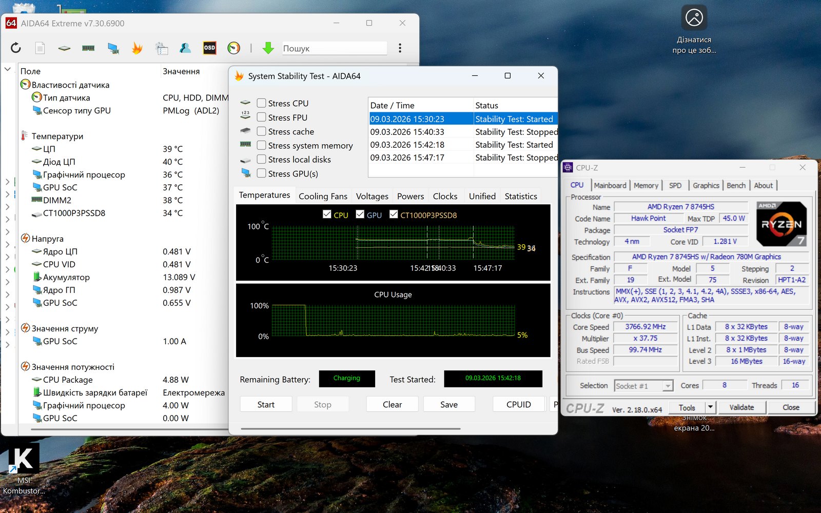 AMD Ryzen 7 8745HS (8 ядер/16 потоков 3,8 ГГц, до 4,9 ГГц в Boost-режиме, 16 МБ L3, TDP 35-54 Вт), архитектура Zen 4 |