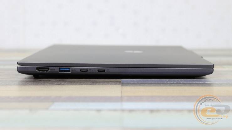 На левой грани размещены HDMI 1.4, USB-A 3.2 Gen1 и два USB-C 3.2 Gen1 с поддержкой DisplayPort и Power Delivery.