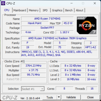 Процессор поддерживает современные инструкции MMX, SSE1-4.2, AVX, AVX2, AVX512, FMA3 и SHA, что обеспечивает совместимость с широким спектром программ и оптимизации. Важно отметить, что Ryzen 7 8745HS не имеет встроенного NPU (Neural Processing Unit), поэтому аппаратное ускорение задач искусственного интеллекта здесь отсутствует.