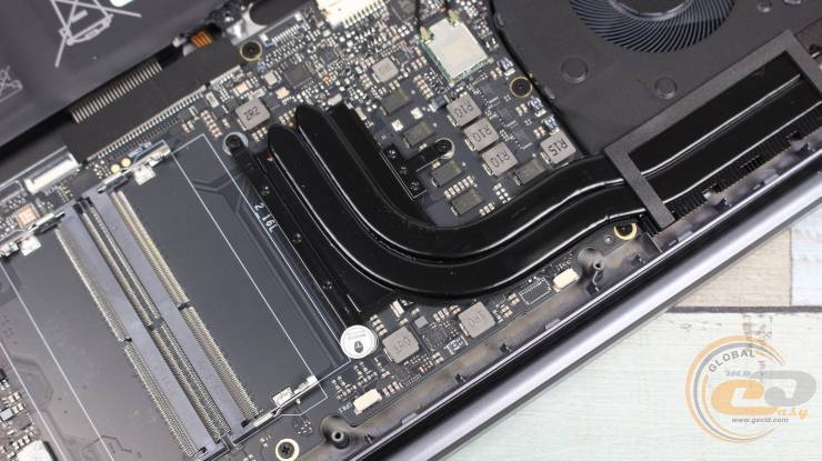Система охлаждения включает в себя один вентилятор радиального типа, который создает воздушный поток сквозь радиатор. Тепло от CPU отводится двумя тепловыми трубками, охватывающими зону процессора и VRM. Все элементы объединены в единый тепловой контур, что обеспечивает эффективное рассеяние тепла даже под продолжительной нагрузкой.