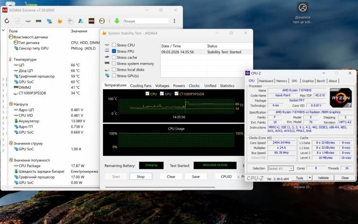 FPU-тест вывел систему на предельную тепловую нагрузку: температура CPU стабильно держалась на уровне 66°C, потребление CPU превышало 17,87Вт, а частоты снизились. Вентиляторы работали на максимуме, но система сохраняла контроль.