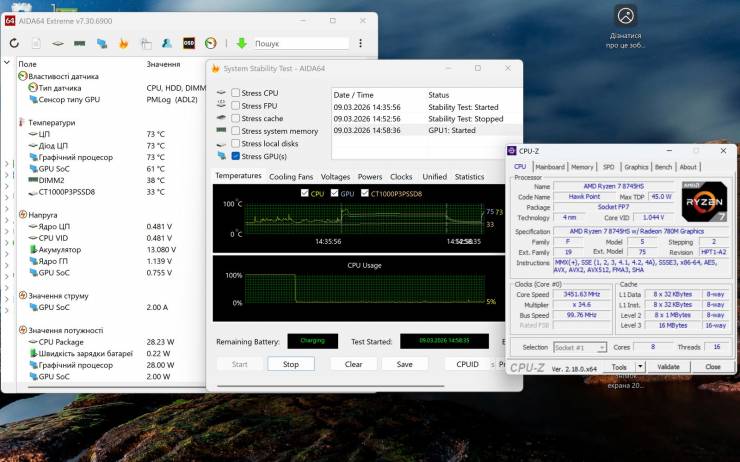 При отдельной нагрузке на GPU температура интегрированного видеоядра достигла 73°C, потребление – 28Вт. Система охлаждения справилась без просадок частот или шумовых пиков.
