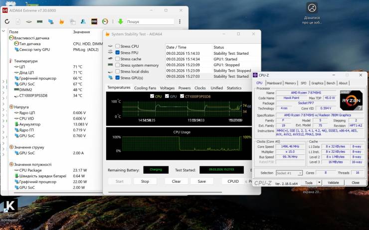 Комплексный прогрев GPU и FPU в AIDA 64 смоделировал наихудший сценарий: температура GPU – 66°C, CPU – 71°C, потребление – более 22Вт и 23Вт соответственно. Частоты при этом существенно просели, а вентиляторы работали на грани, но система не потеряла контроль.
