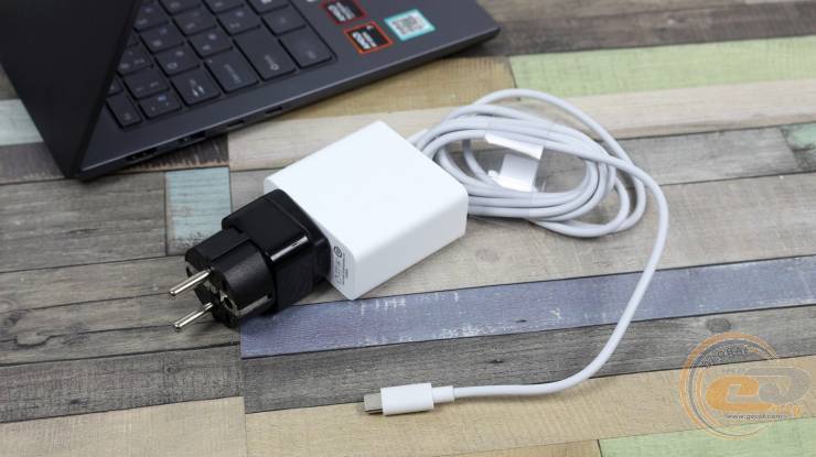 Ноутбук комплектуется блоком питания с разъемом USB-C (модель A869-200325C-CN от Shenzhen Aodatong Technology), обеспечивающим стабильное энергоснабжение системы. Устройство поддерживает широкий диапазон входного напряжения – 100–240 В переменного напряжения (1,7 А, 50/60 Гц), что позволяет использовать его в разных сетях. Исходные параметры составляют 20 В постоянного напряжения при 3,25 А, максимальная мощность – 65 Вт.