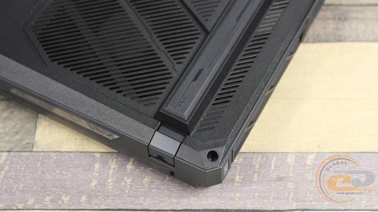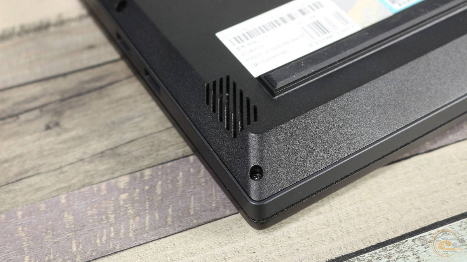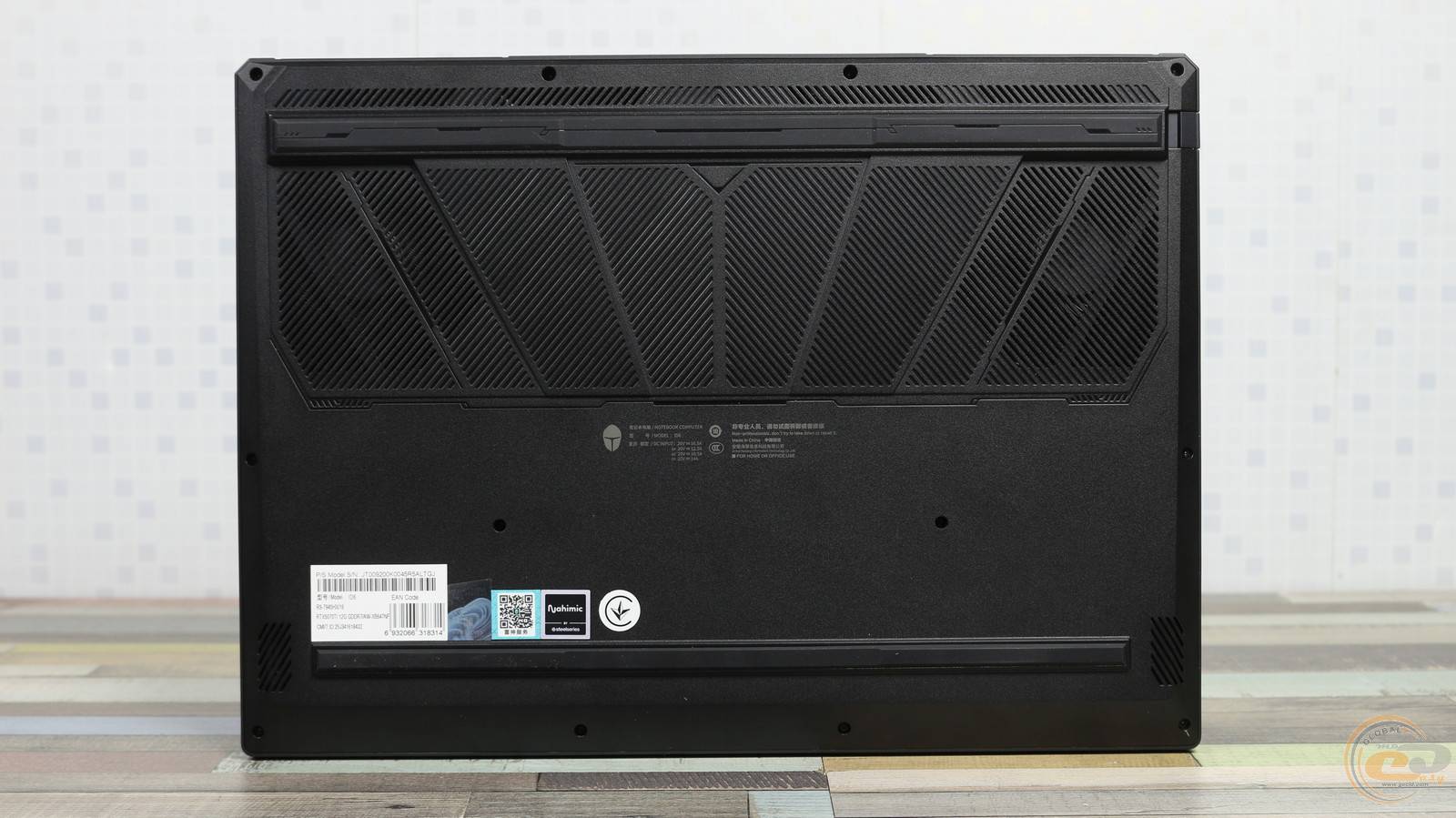 Нижняя часть корпуса полностью выполнена из пластика без металлических вставок или декоративных элементов. От центральной зоны к задней части простирается большая площадь вентиляционных проемов, что обеспечивает эффективный теплообмен даже в условиях продолжительной нагрузки. В центре – надписи с техническими характеристиками и серийным номером, а справа – наклейки с QR-кодом и логотипами сертификации, в частности Nahimic Audio by SteelSeries.