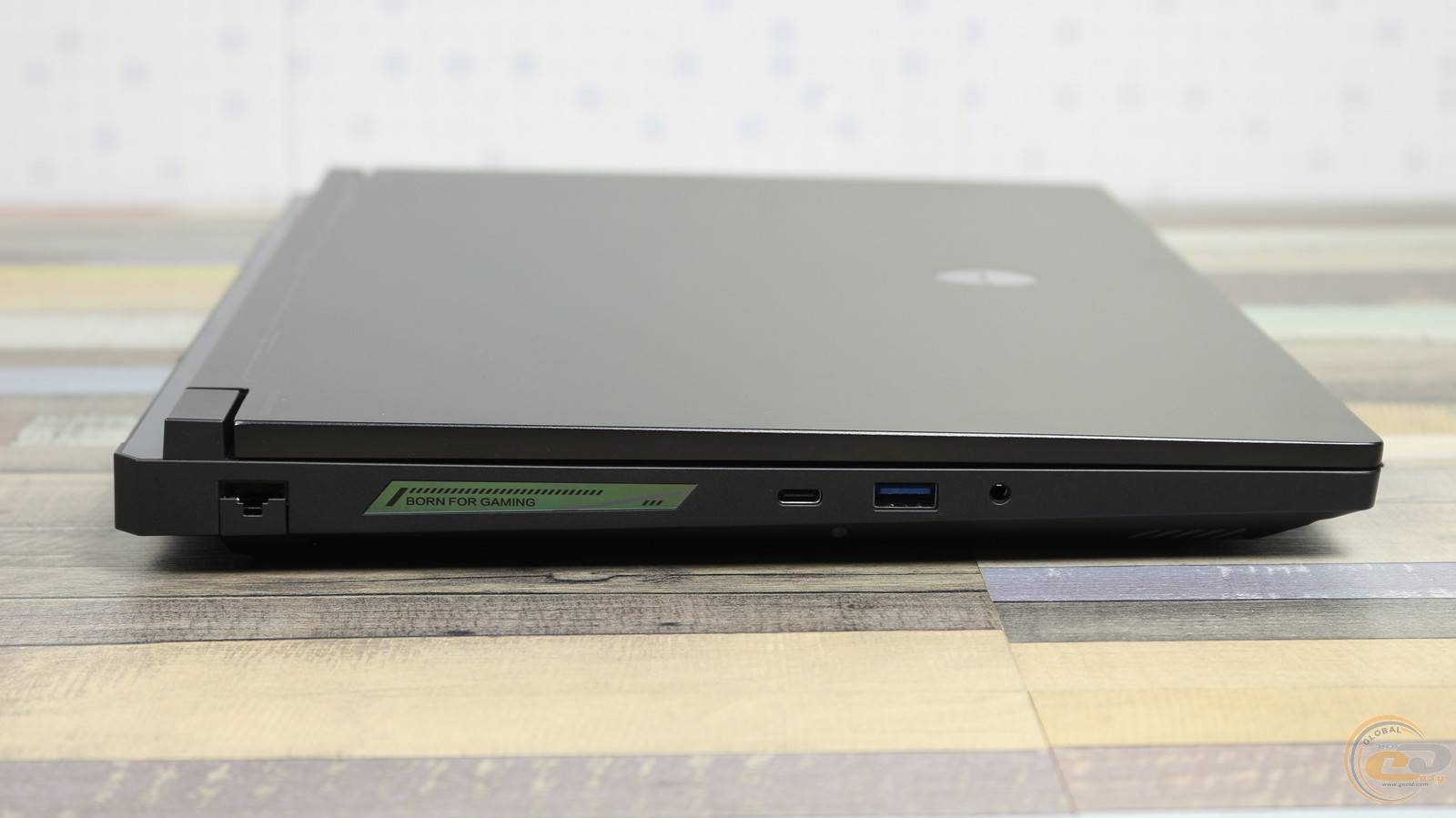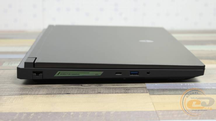 На левом боку расположен комбинированный 3,5 мм аудиоразъем для гарнитуры, USB-C 3.2 Gen2 с поддержкой DisplayPort и Power Delivery, порт RJ-45 Ethernet (2.5G LAN) и USB-A 3.2 Gen1. Здесь же, ближе к петле, расположена декоративная вставка с фирменным слоганом "Born for Gaming", придающим корпусу узнаваемости и подчеркивающим игровое позиционирование модели.