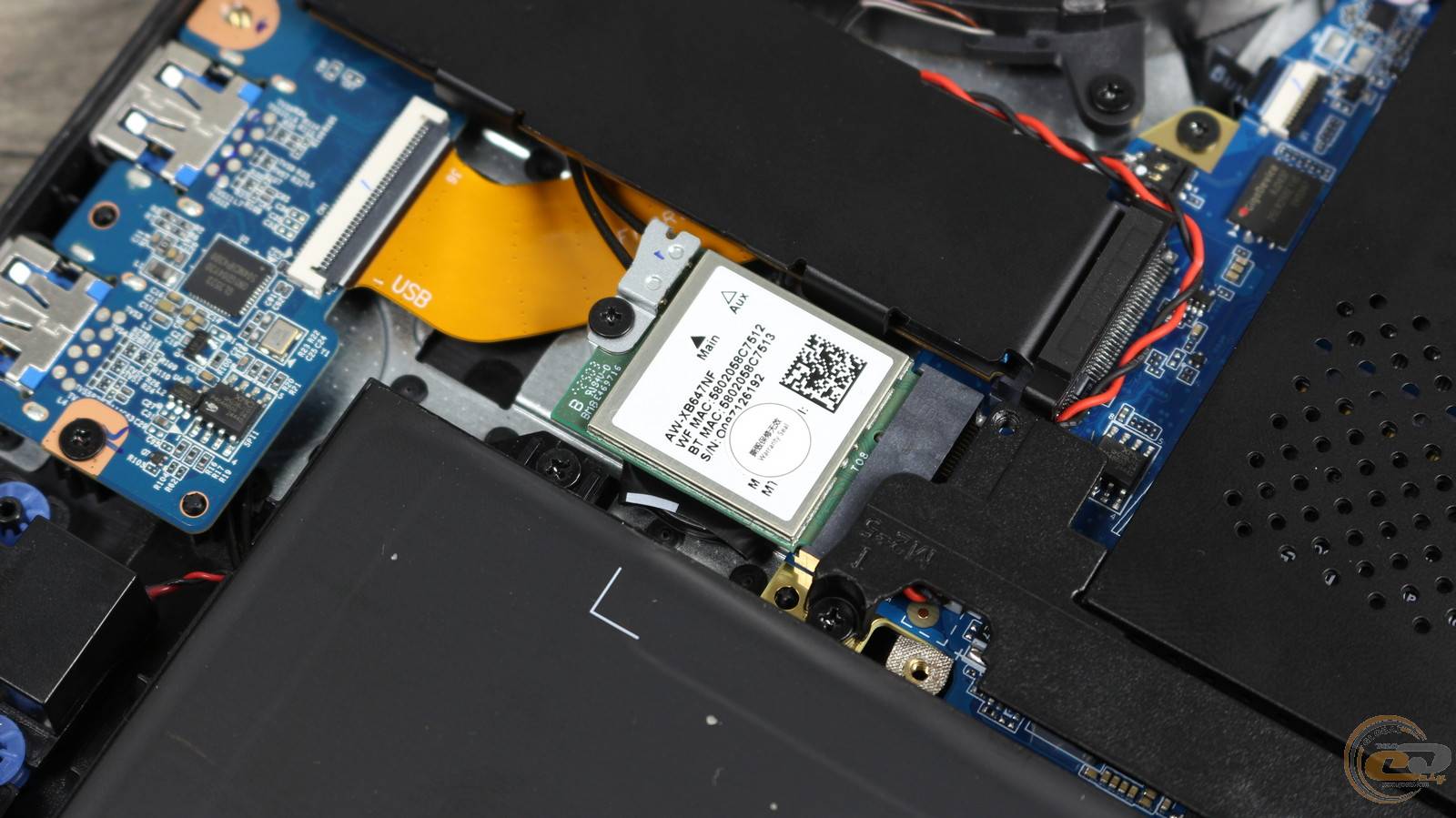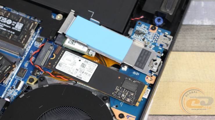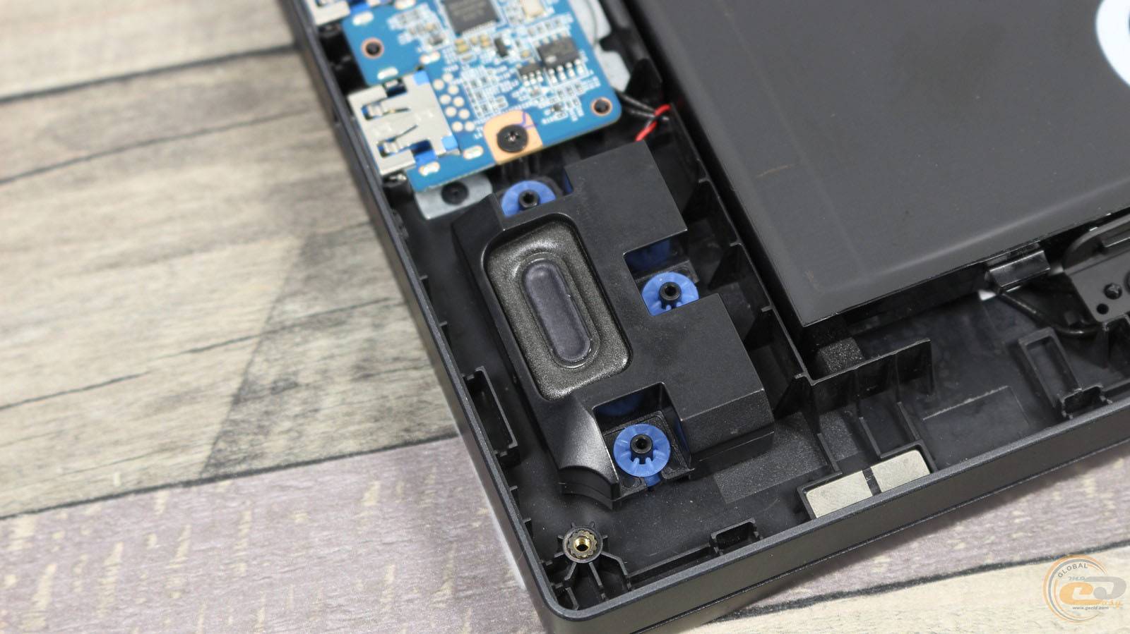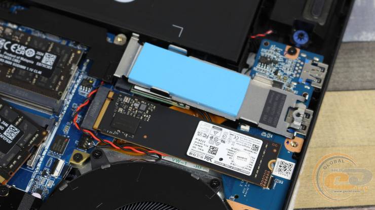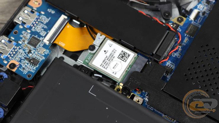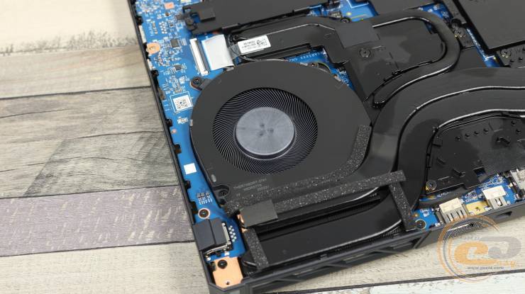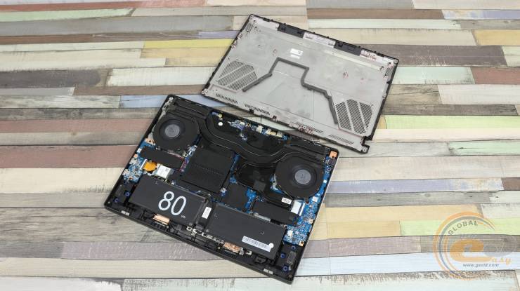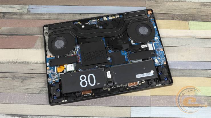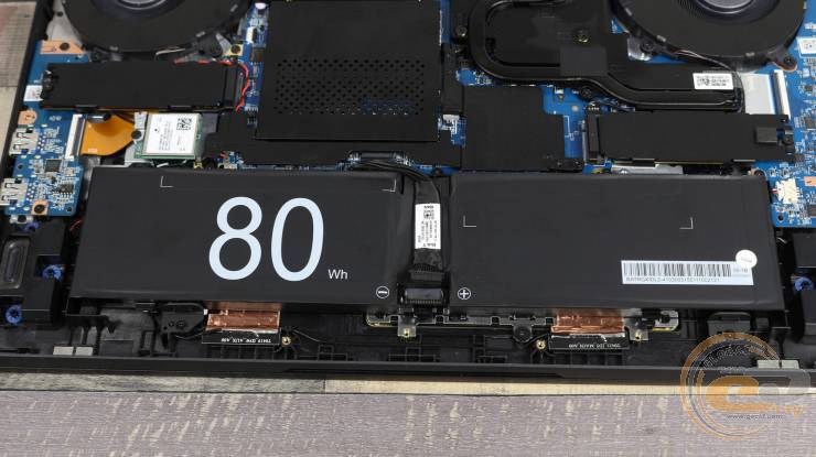 Внутри ноутбука использована классическая схема компоновки: большую часть площади занимает системная плата с разветвленной системой охлаждения, а вдоль передней кромки размещена большая аккумуляторная батарея.