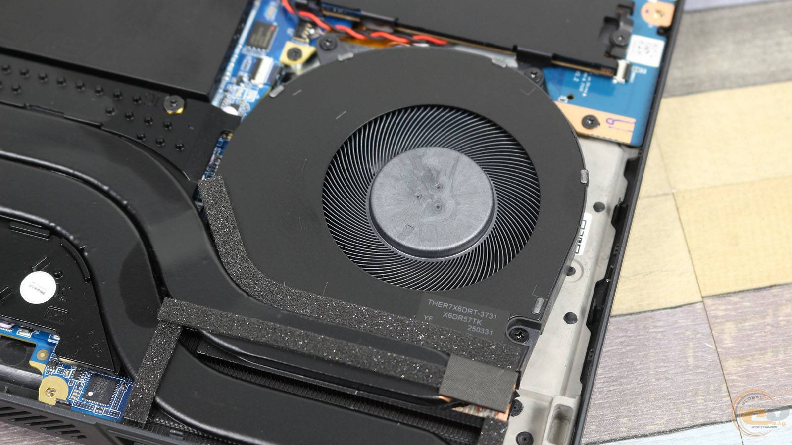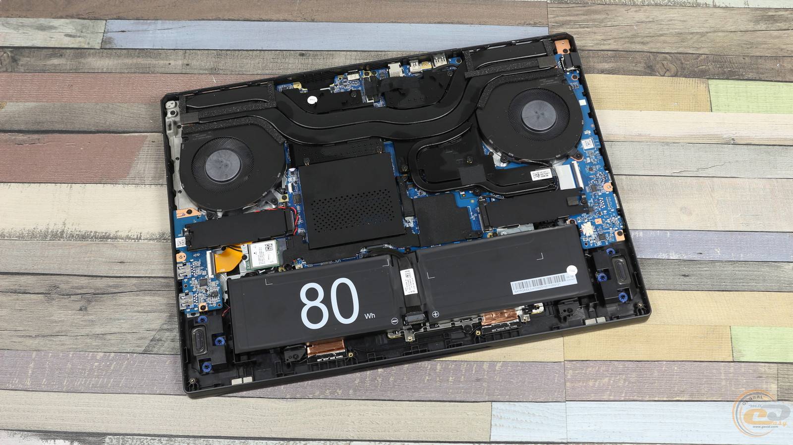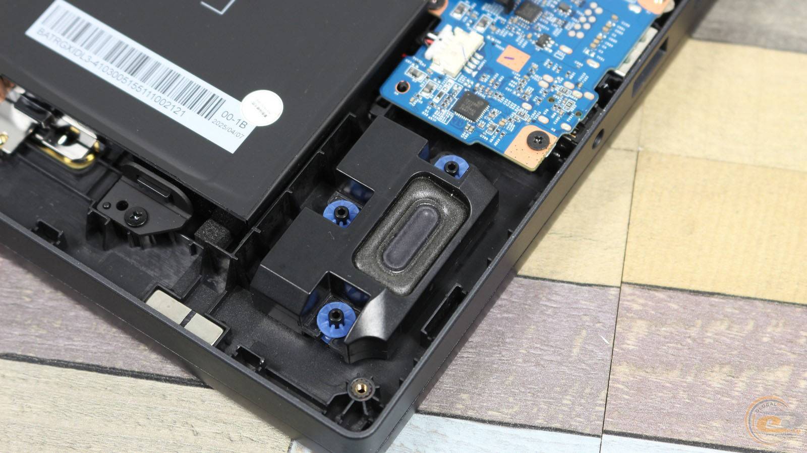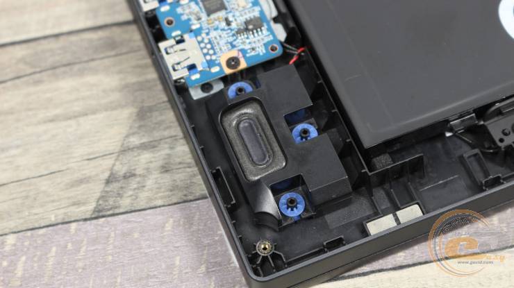 Внутри ноутбука использована классическая схема компоновки: большую часть площади занимает системная плата с разветвленной системой охлаждения, а вдоль передней кромки размещена большая аккумуляторная батарея.