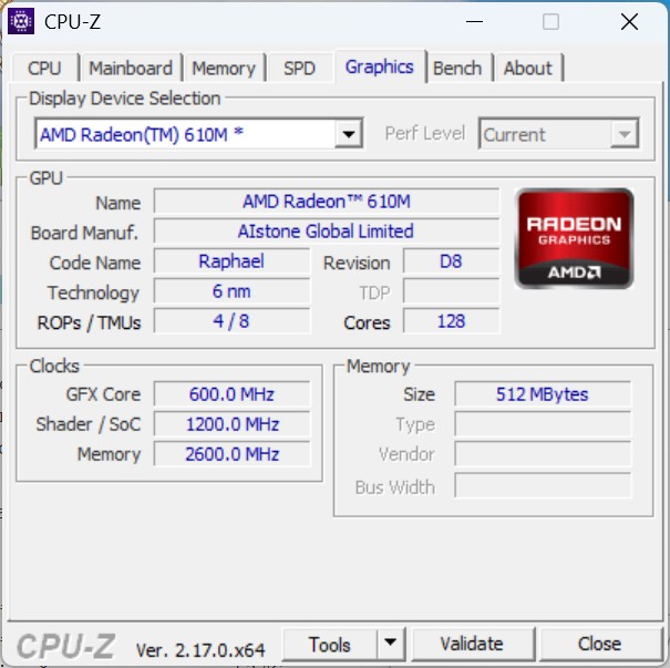 Интегрированное видеоядро AMD Radeon 610M (Raphael, 6-нм) имеет 128 потоковых процессоров, 4 ROP и 8 TMU. Частота GPU – до 2200 МГц, SoC – до 1200 МГц. Объем памяти – 512 МБ. Это базовое решение для энергоэффективного режима, которое автоматически активируется при низкой нагрузке.