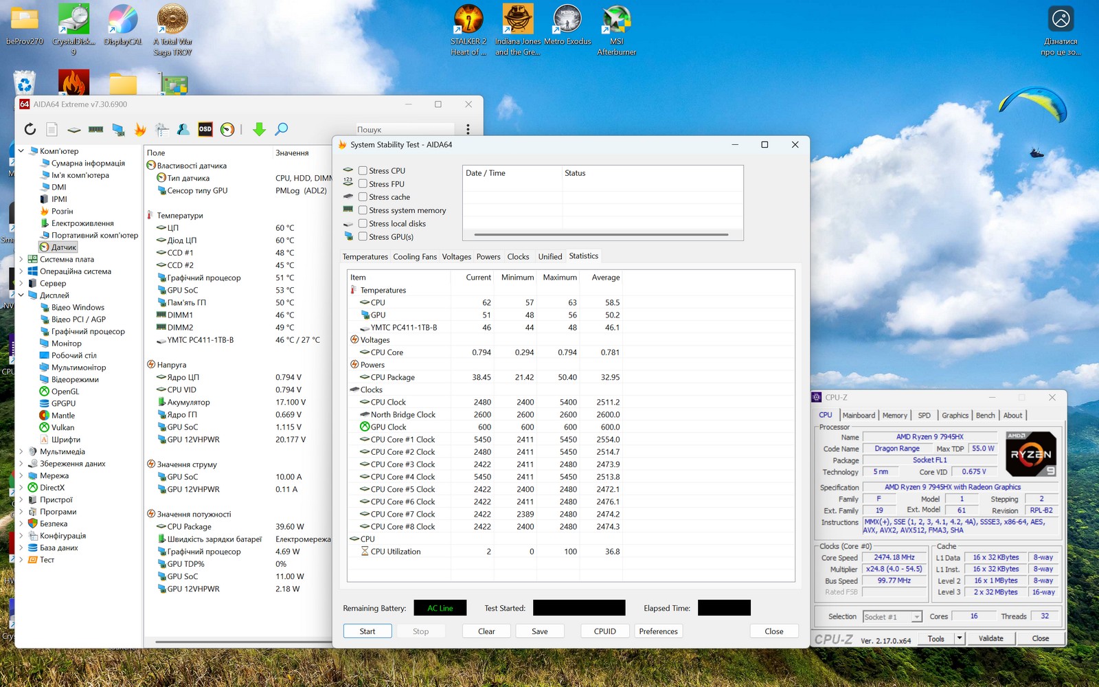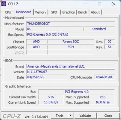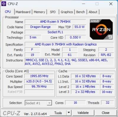 Thunderobot RS16 построен на платформе AMD Dragon Range и оснащен процессором AMD Ryzen 9 7945HX (5-нм, Socket FL1). Это 16-ядерный 32-поточный чип без разделения на производительные и энергоэффективные ядра. В тестах (CPU-Z) частота изменялась в диапазоне 2,0–5,4 ГГц в зависимости от нагрузки с базовым множителем x20. Кэш-память: 16×1 МБ L2 и 2×32 МБ L3, что обеспечивает быстрый доступ к данным при многопоточных нагрузках. Поддерживаются инструкции MMX, SSE1-4.2, AVX, AVX2, AVX512, FMA3, SHA.